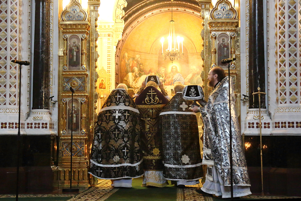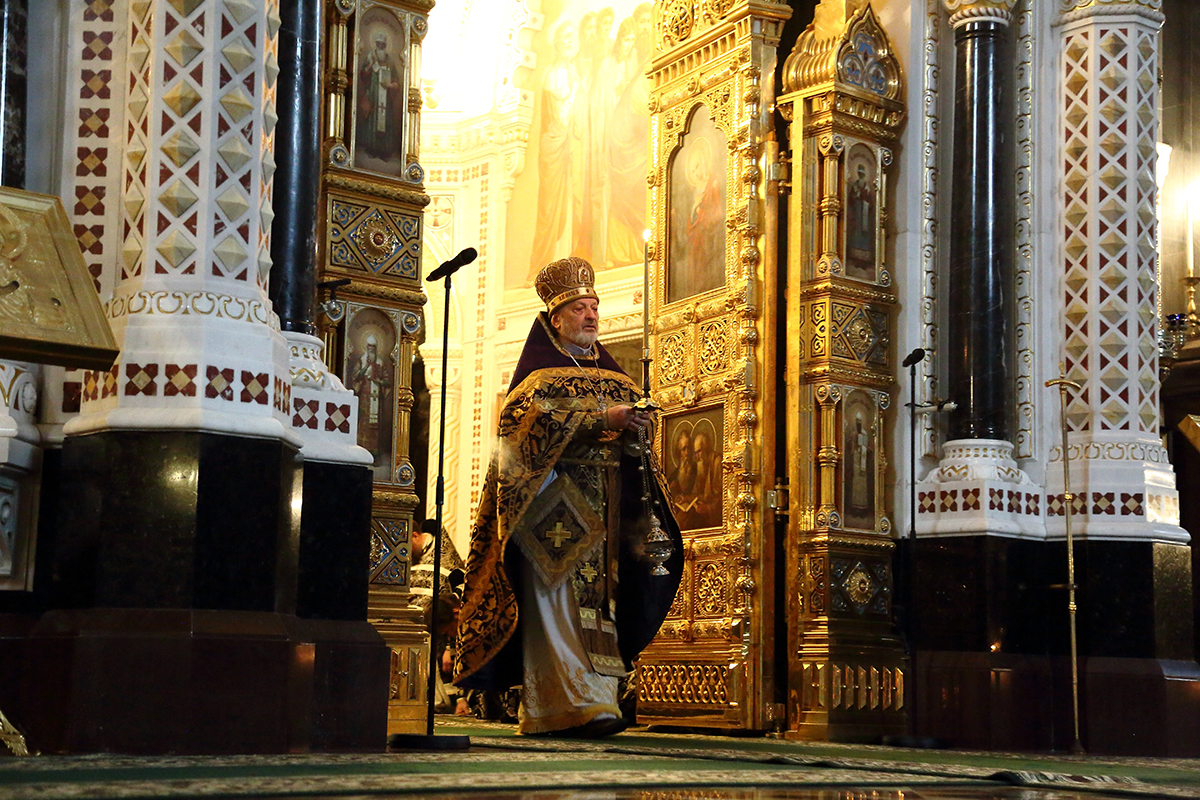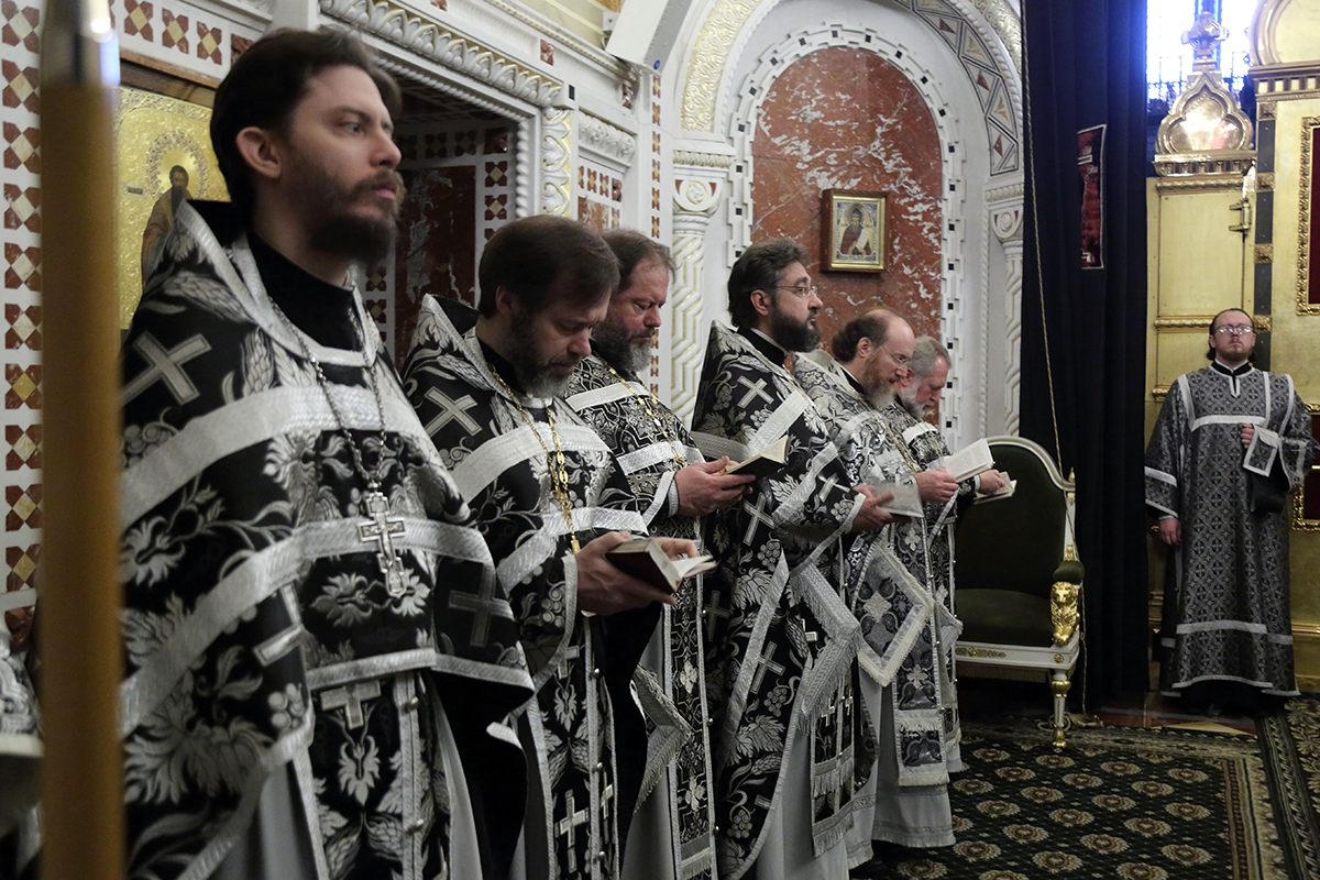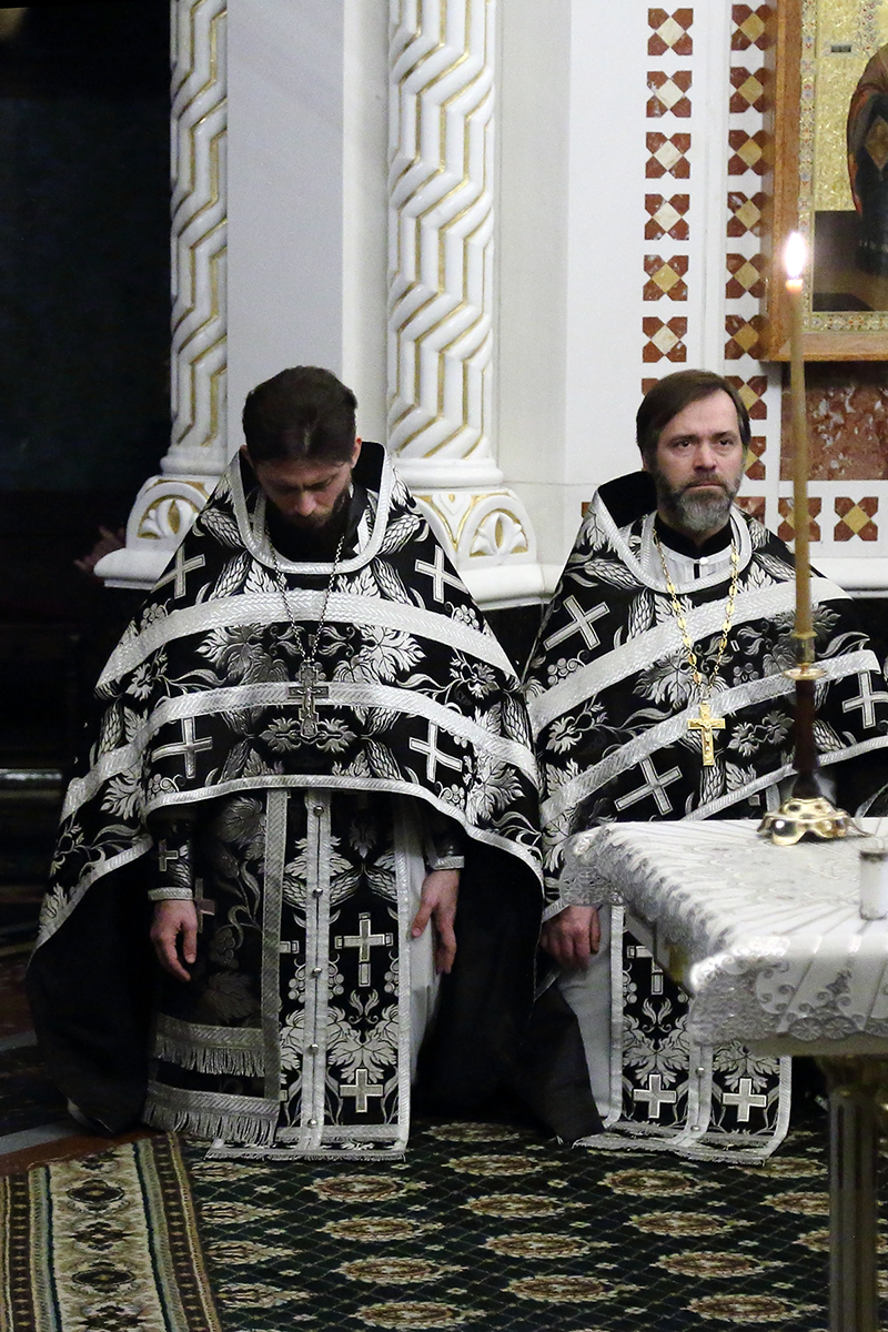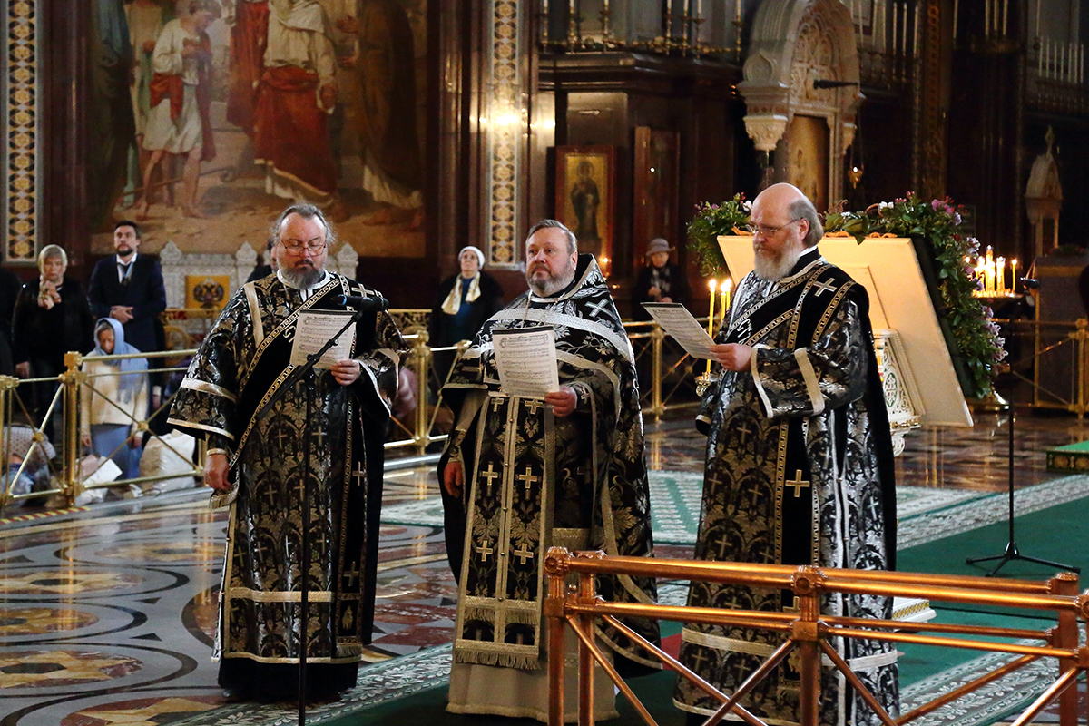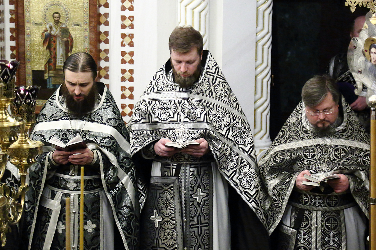 Песнопение «Да исправится молитва моя» исполнило трио клириков Храма Христа Спасителя: протоиерей Андрей Марущак, протодиакон Николай Филатов, протодиакон Дионисий Пряхин.