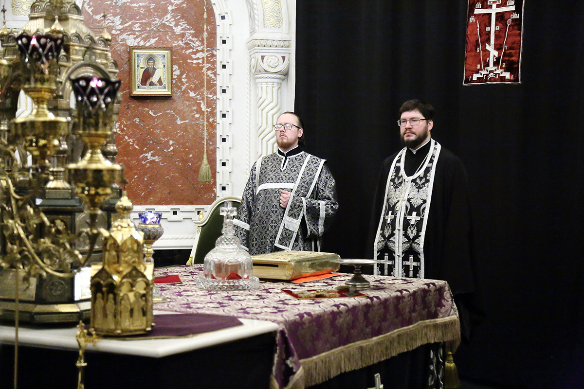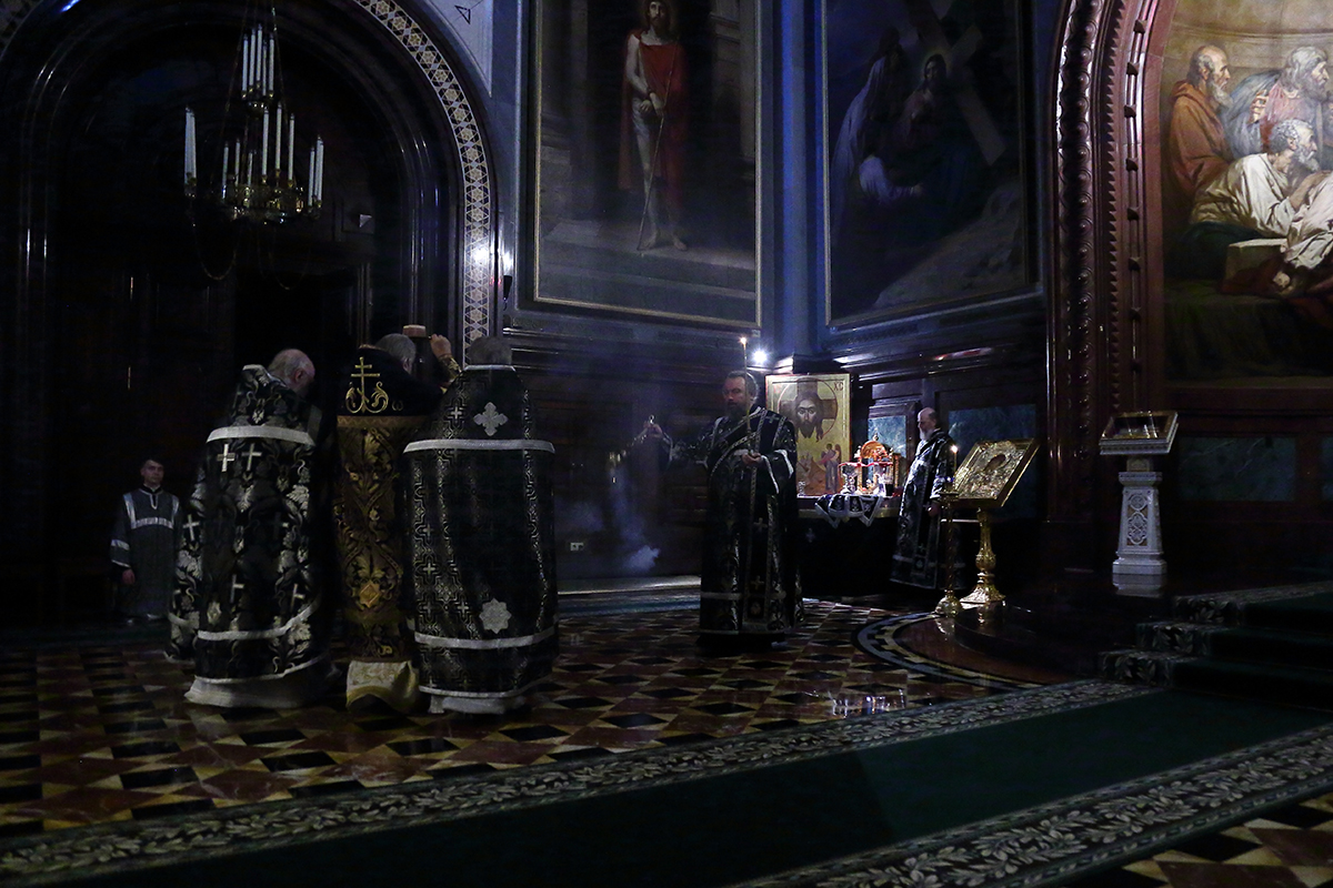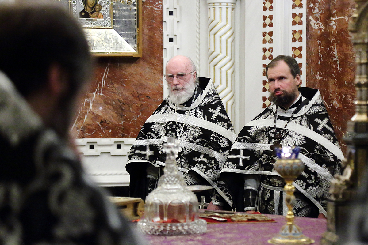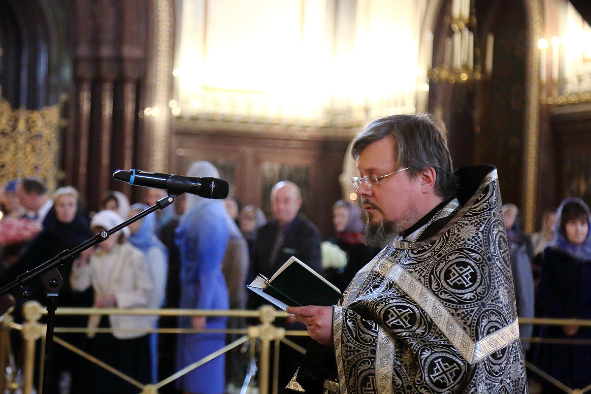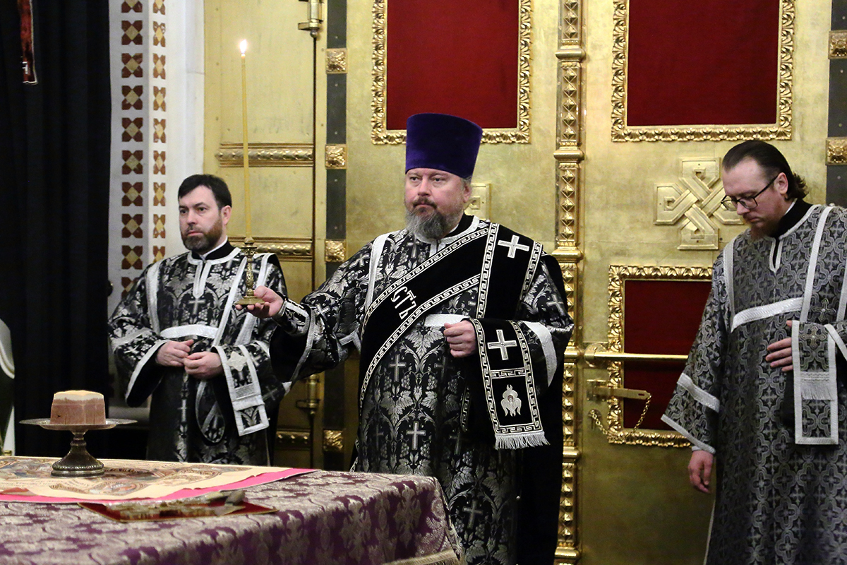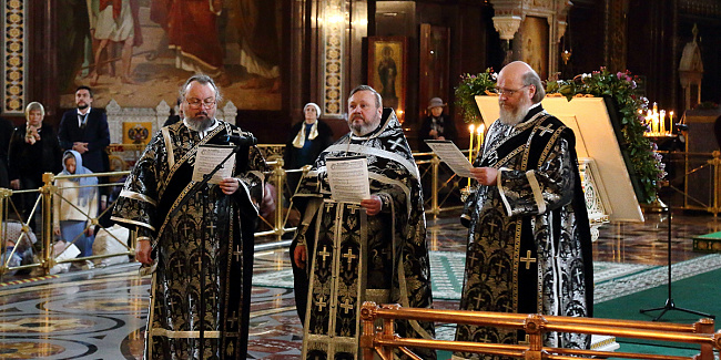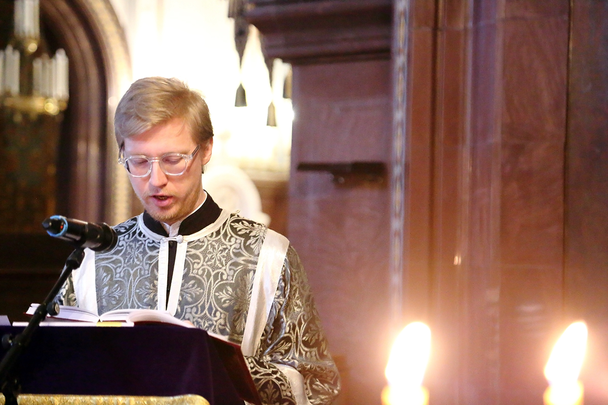 Песнопение «Да исправится молитва моя» исполнило трио клириков Храма Христа Спасителя: протоиерей Андрей Марущак, протодиакон Николай Филатов, протодиакон Дионисий Пряхин.