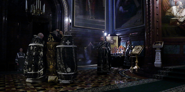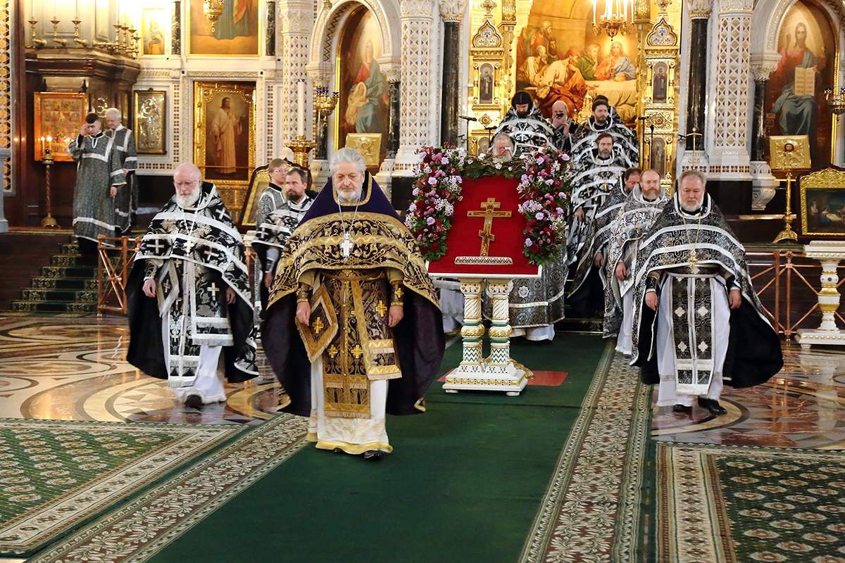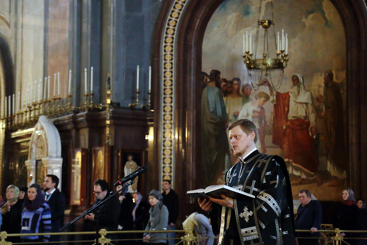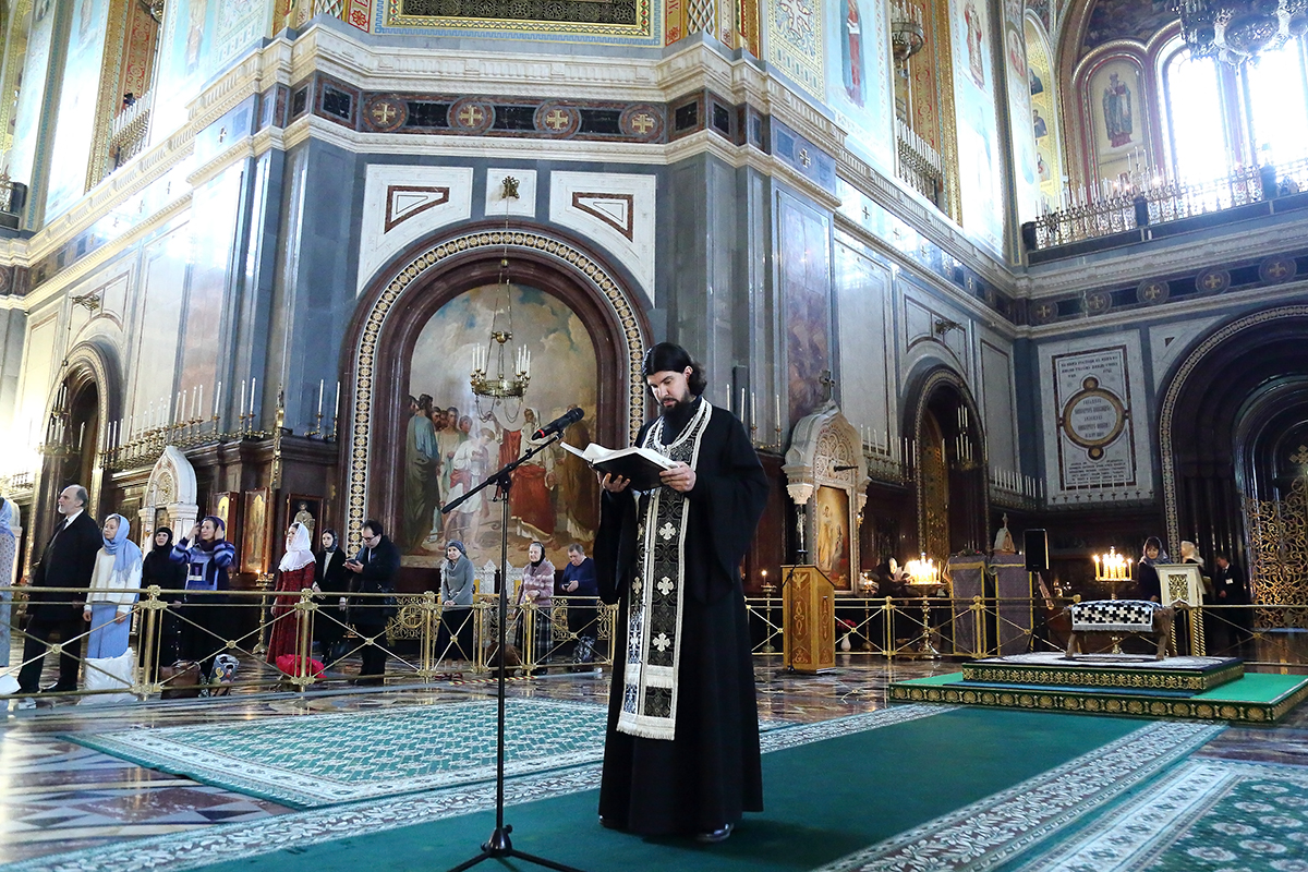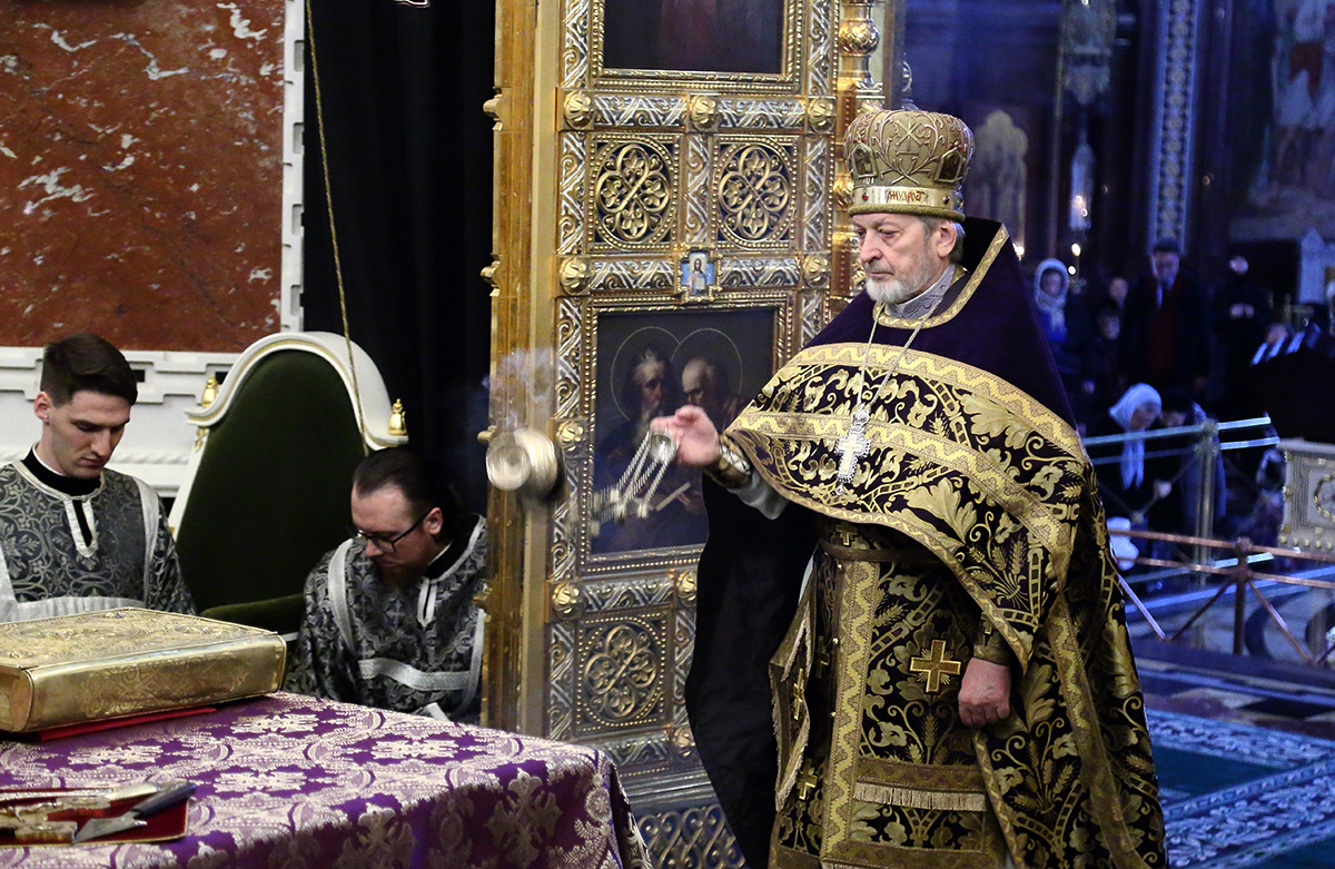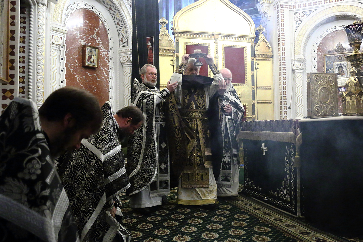 Песнопение «Да исправится молитва моя» исполнило трио клириков Храма Христа Спасителя: протоиерей Андрей Марущак, протодиакон Николай Филатов, протодиакон Дионисий Пряхин.