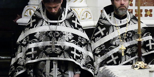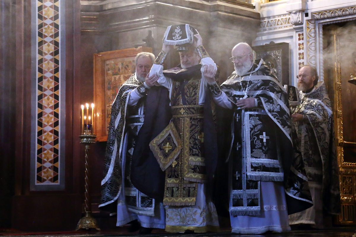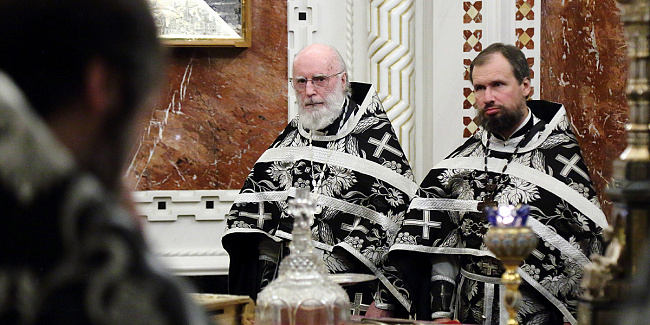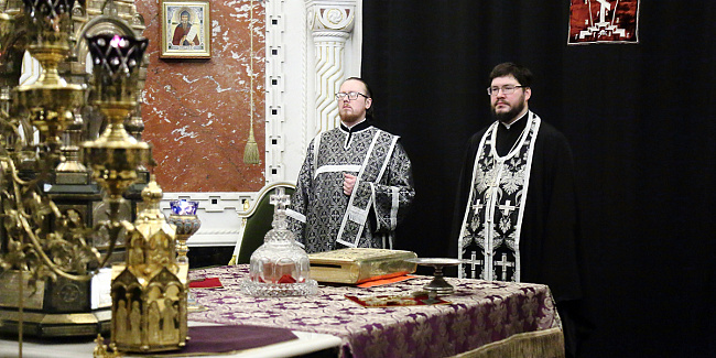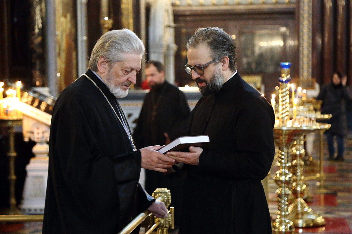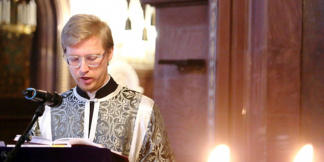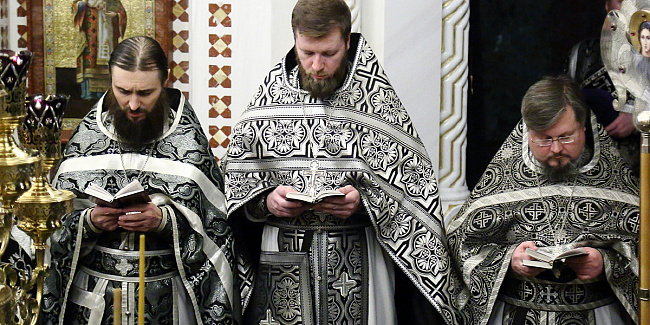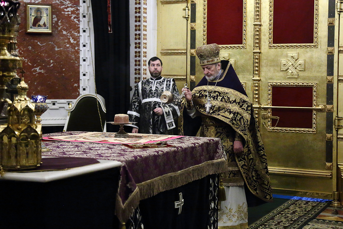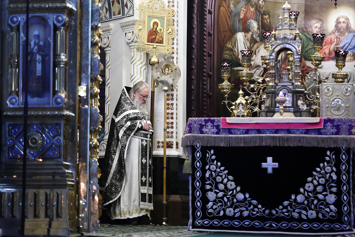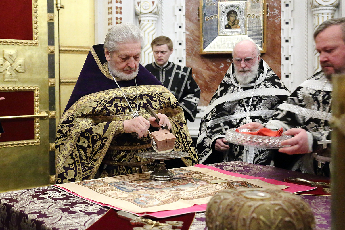Песнопение «Да исправится молитва моя» исполнило трио клириков Храма Христа Спасителя: протоиерей Андрей Марущак, протодиакон Николай Филатов, протодиакон Дионисий Пряхин.