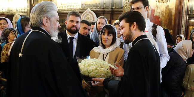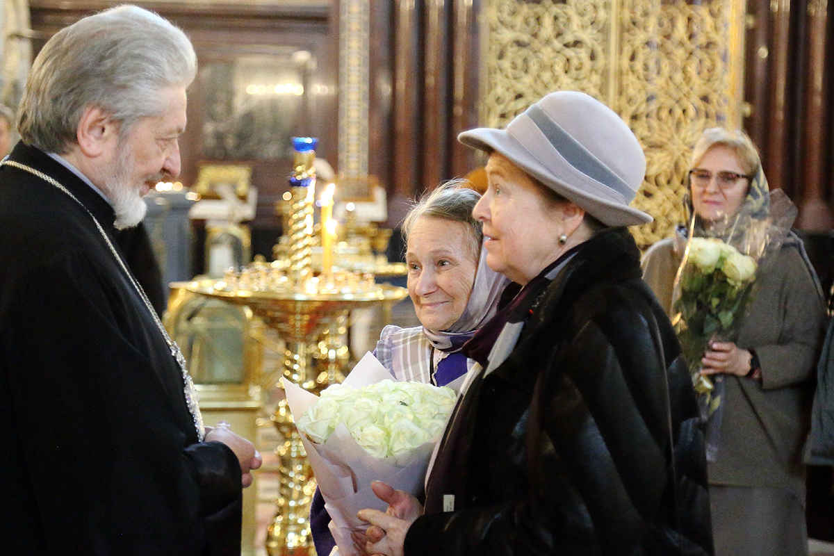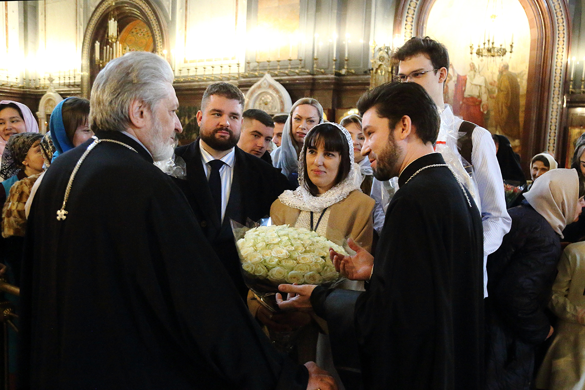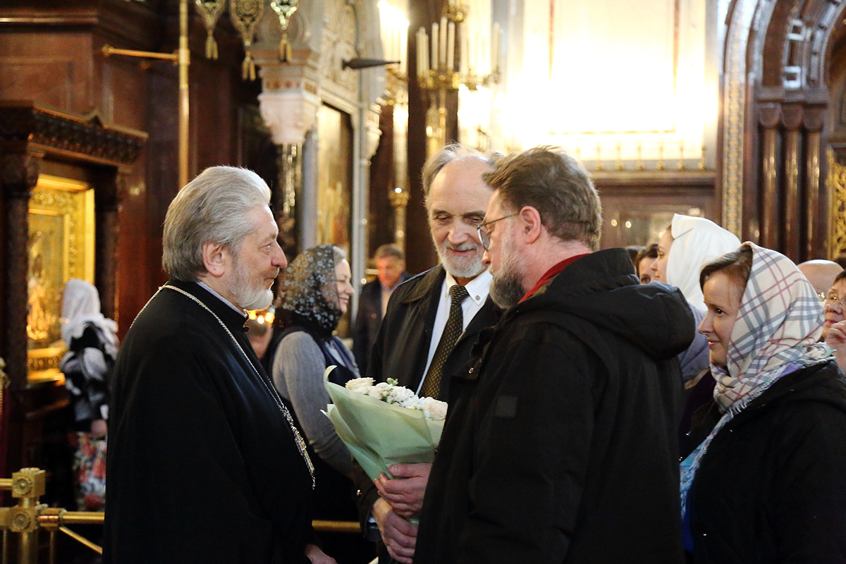 После богослужения хор, слушатели Воскресной школы для взрослых, участники молодежного объединения «Соборяне», сотрудники храма и прихожане смогли лично поздравить отца Михаила.