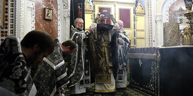 По заамвонной молитве протоиерей Михаил Рязанцев и сослужившее духовенство совершили славление и поклонились Кресту Господню. Перед иконой Божией Матери "Феодоровская" отец Ключарь возглавил молебное пение.
