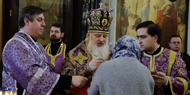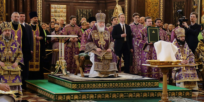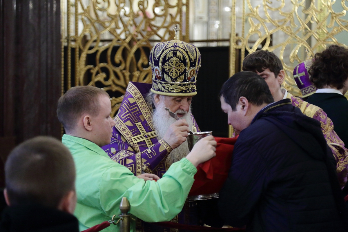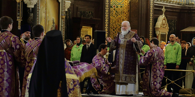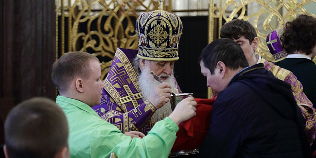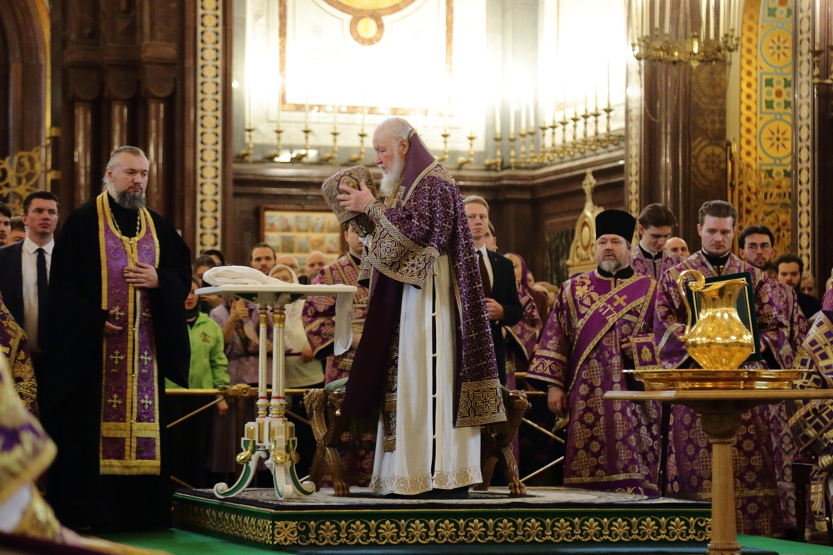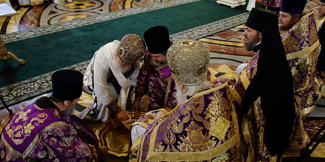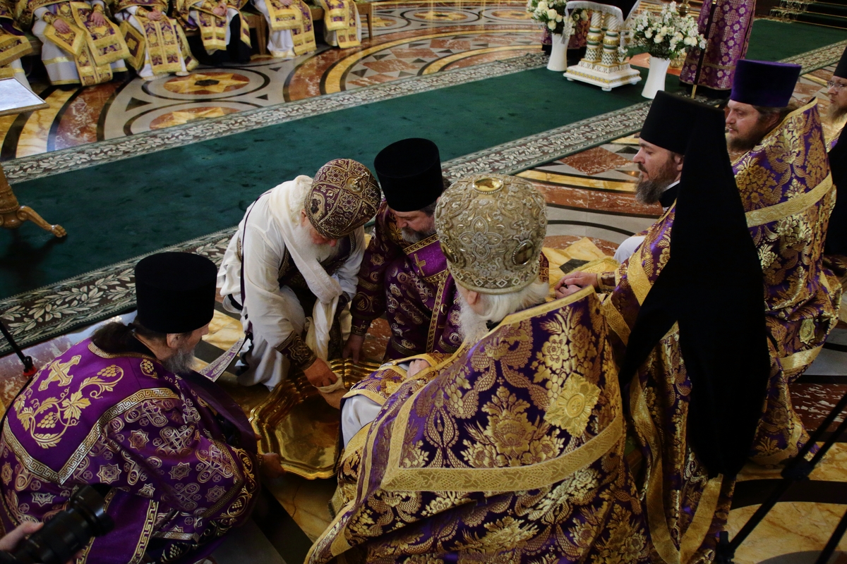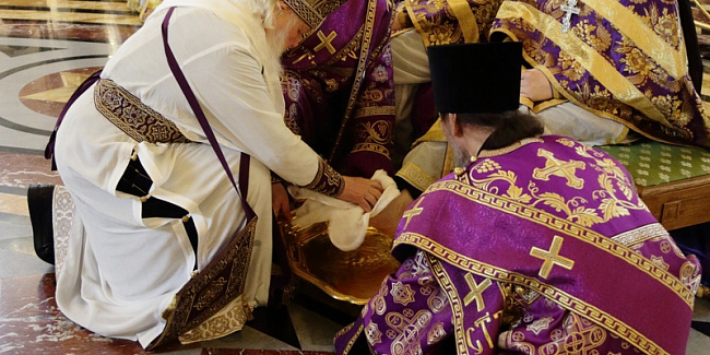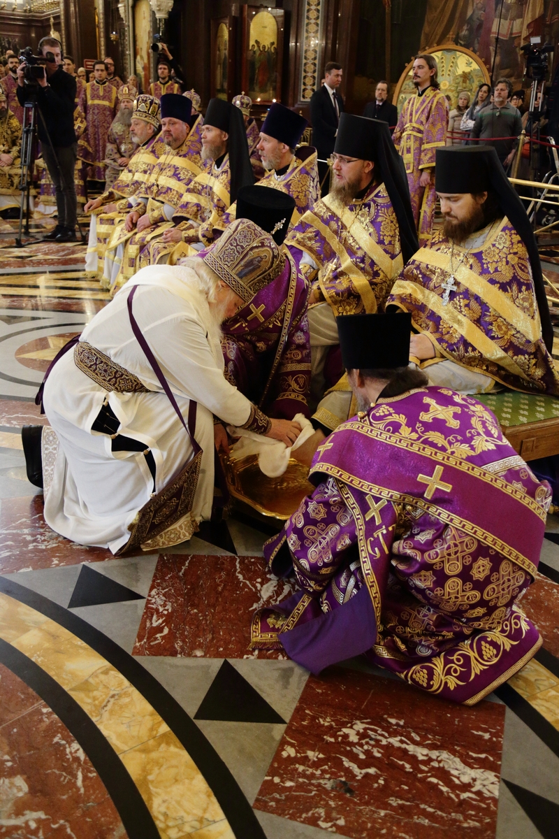 По окончании Литургии Святейший Патриарх Кирилл совершил чин омовения ног. По образу Христа, умывшего ноги своим ученикам-апостолам за Тайной Вечерей, Предстоятель омыл в храме ноги 12 священнослужителям, в знак глубокого смирения и служения народу Божию.