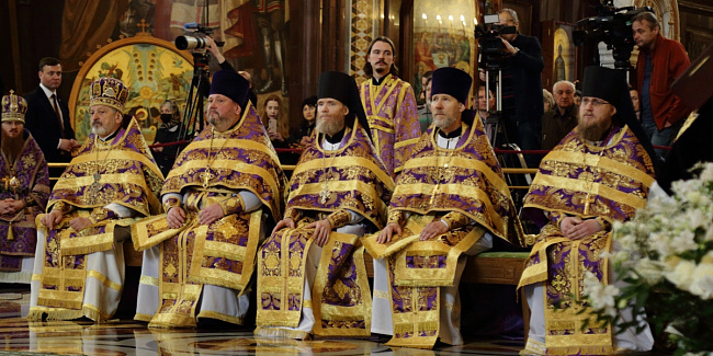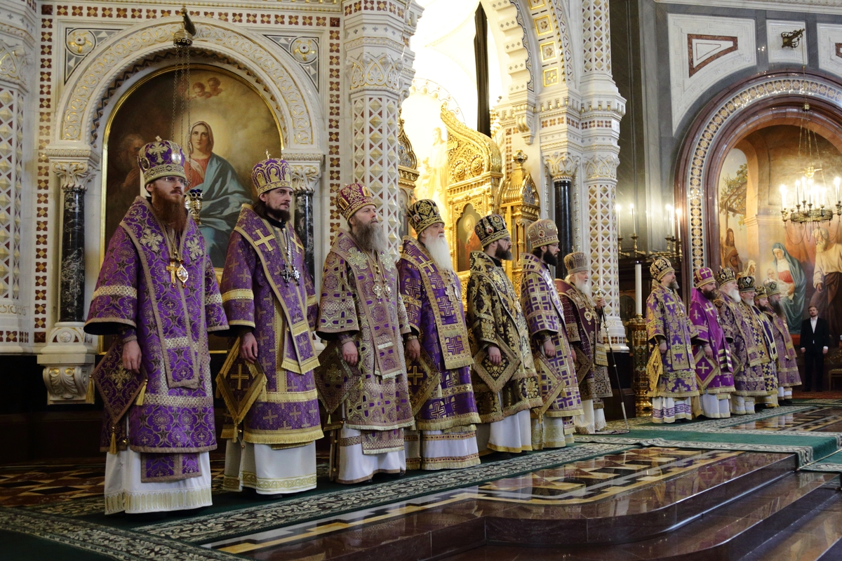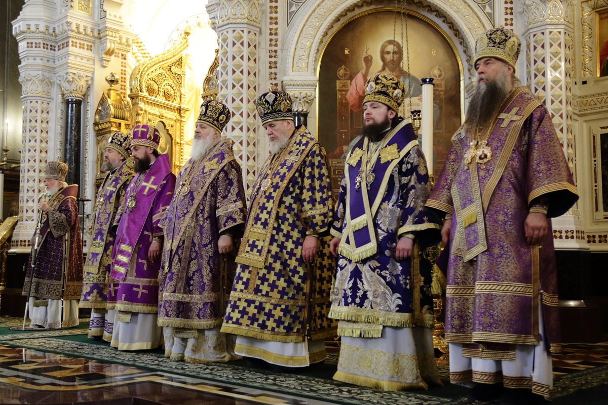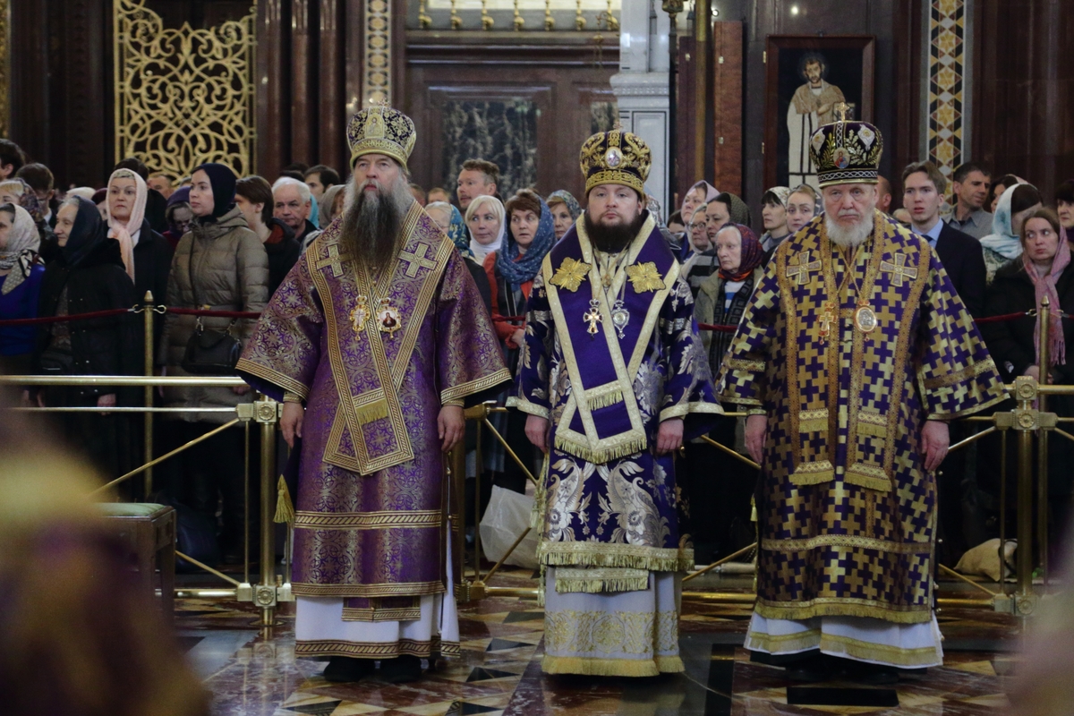 Его Святейшеству сослужили: митрополит Воскресенский Григорий, управляющий делами Московской Патриархии, первый викарий Патриарха Московского и всея Руси по г. Москве, наместник Новоспасского ставропигиального монастыря; митрополит Волоколамский Антоний, председатель Отдела внешних церковных связей Московского Патриархата; митрополит Звенигородский Арсений; архиепископ Зеленоградский Савва, председатель Синодального миссионерского отдела, заместитель управляющего делами Московской Патриархии; епископ Видновский Тихон, наместник Екатерининского ставропигиального монастыря; епископ Серпуховской Роман, наместник Высоцкого ставропигиального монастыря; епископ Балашихинский и Орехово-Зуевский Николай, главный редактор Издательства Московской Патриархии; епископ Павлово-Посадский Силуан, заместитель управляющего делами Московской Патриархии; епископ Истринский Серафим, первый заместитель председателя Издательского Совета Русской Православной Церкви; епископ Раменский Алексий, личный секретарь Святейшего Патриарха Кирилла; епископ Егорьевский Мефодий, и.о. председателя Синодальной библейско-богословской комиссии, ректор Православного Свято-Тихоновского гуманитарного университета, наместник Николо-Угрешского ставропигиального монастыря; епископ Бронницкий Иоанн, наместник Высоко-Петровского ставропигиального монастыря; протопресвитер Владимир Диваков, секретарь Патриарха Московского и всея Руси по г. Москве; протоиерей Михаил Рязанцев, Ключарь Храма Христа Спасителя; протоиерей Андрей Марущак; протоиерей Алексий Миндров; игумен Амвросий (Коньков); иеромонах Мисаил (Сарафанов); иеромонах Косьма (Карташов); иеромонах Памфил (Осокин); иеромонах Виссарион (Красовский); иерей Евгений Головин; иерей Павел Соломатин; иерей Максим Куимов; архидиакон Константин Барган; протодиаконы: Николай Филатов, Дионисий Пряхин; диаконы: Иоанн Клинцов, Димитрий Стацюк.