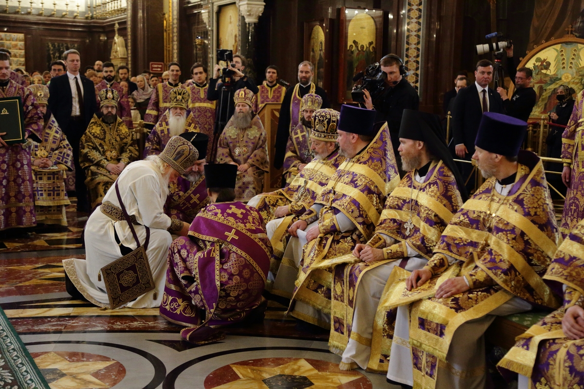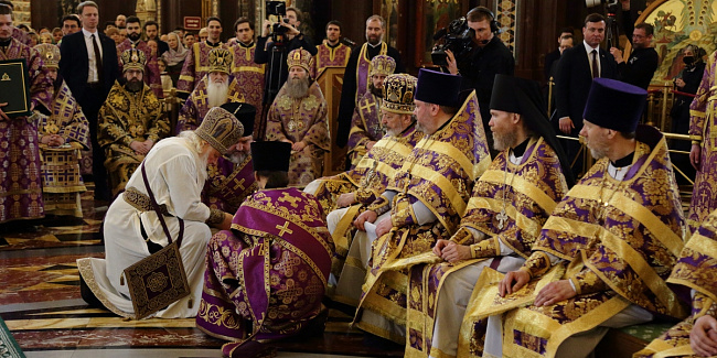 После омовения ног последнего священника Предстоятель Русской Церкви облачился в снятые прежде облачения, взошел на амвон и обратился к верующим с Первосвятительским словом.