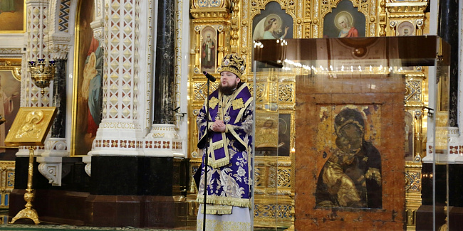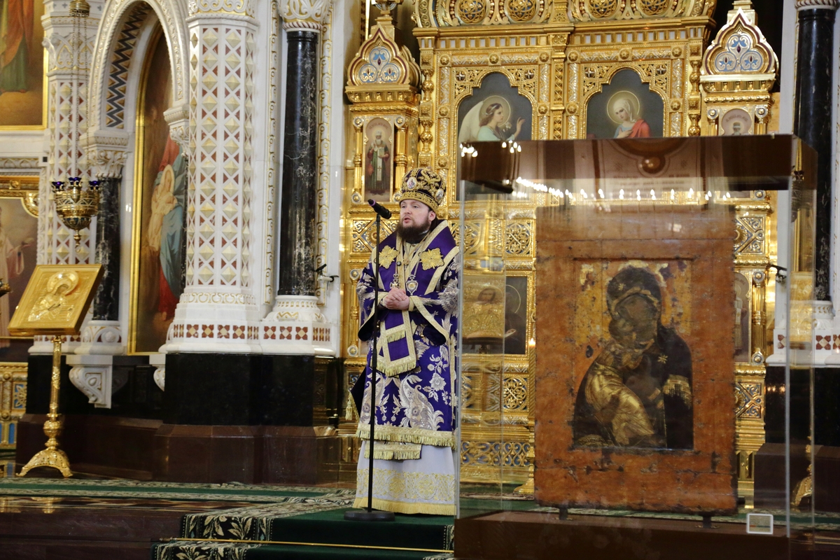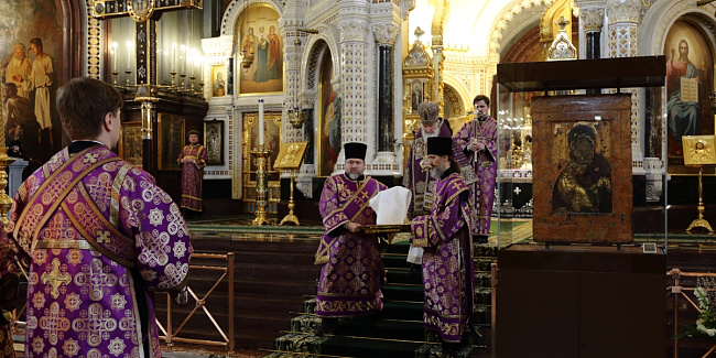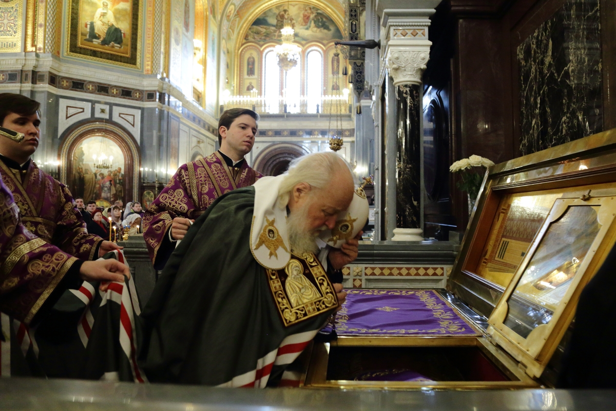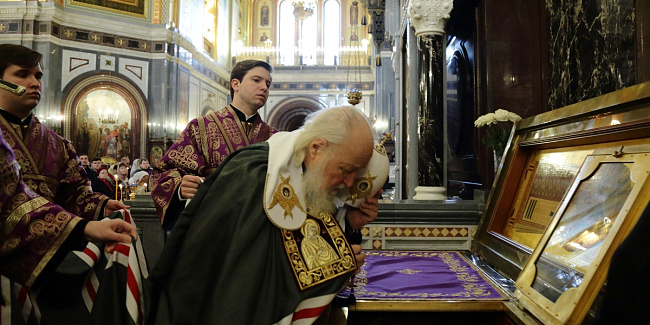 По прибытии в Храм Христа Спасителя Предстоятель Русской Православной Церкви поклонился чудотворным Владимирской и Донской иконам Божией Матери и честным мощам святителя Филарета, митрополита Московского.