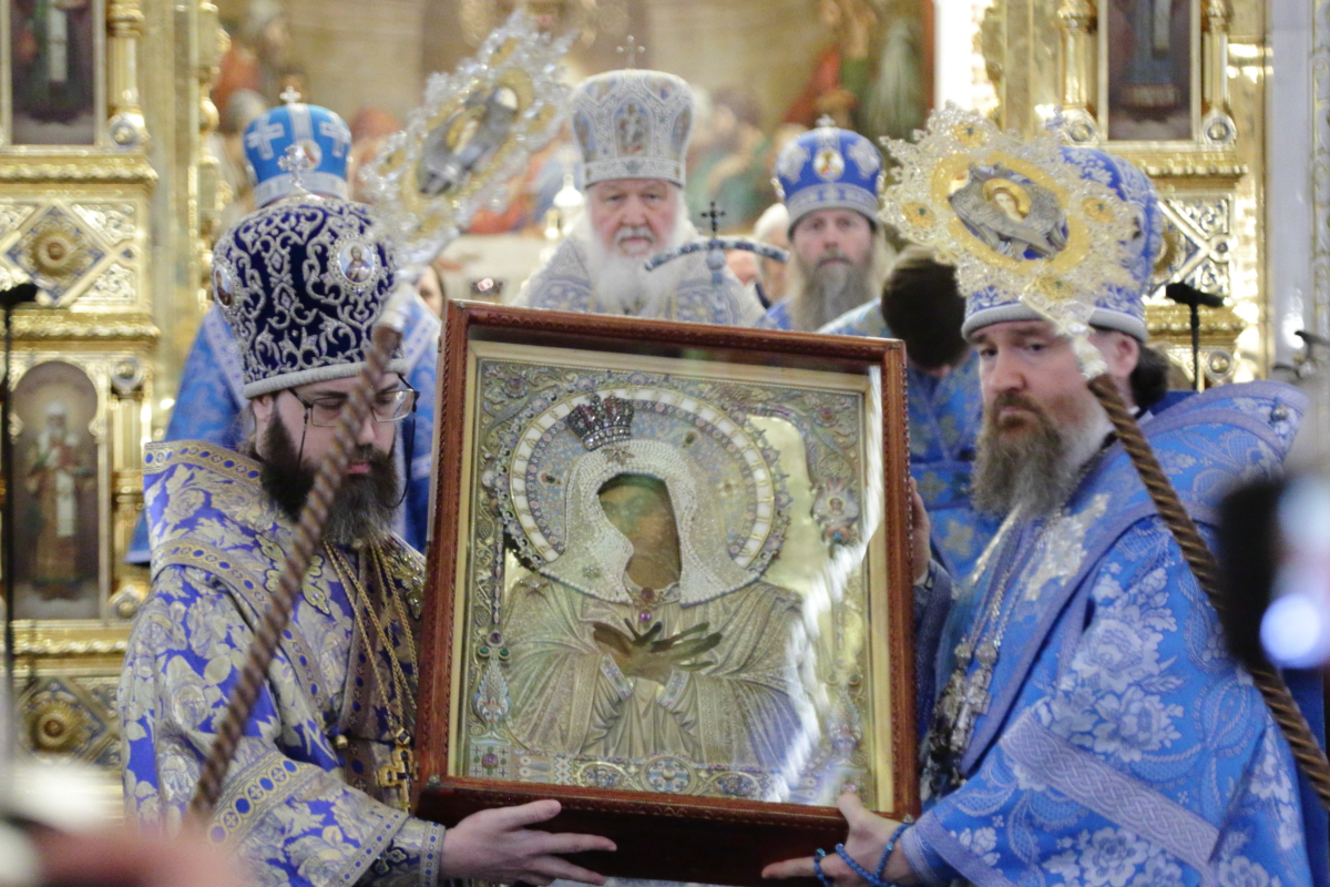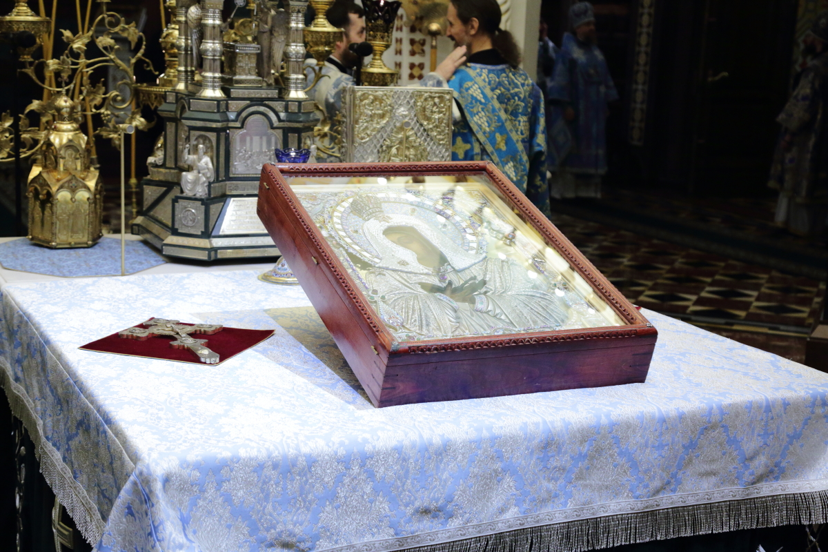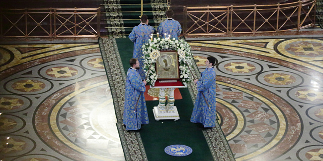 В начале Патриаршего богослужения Серафимо-Дивеевская икона Пресвятой Богородицы была вынесена из алтаря и установлена на аналое в центре Храма Христа Спасителя.