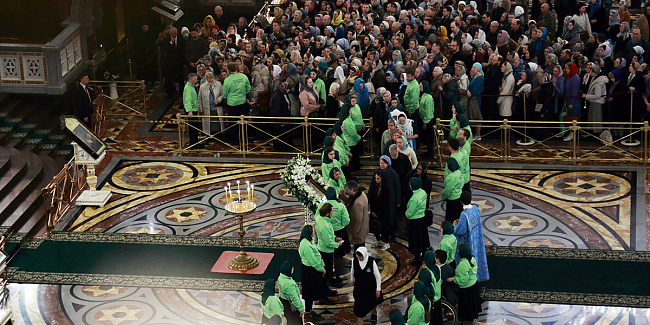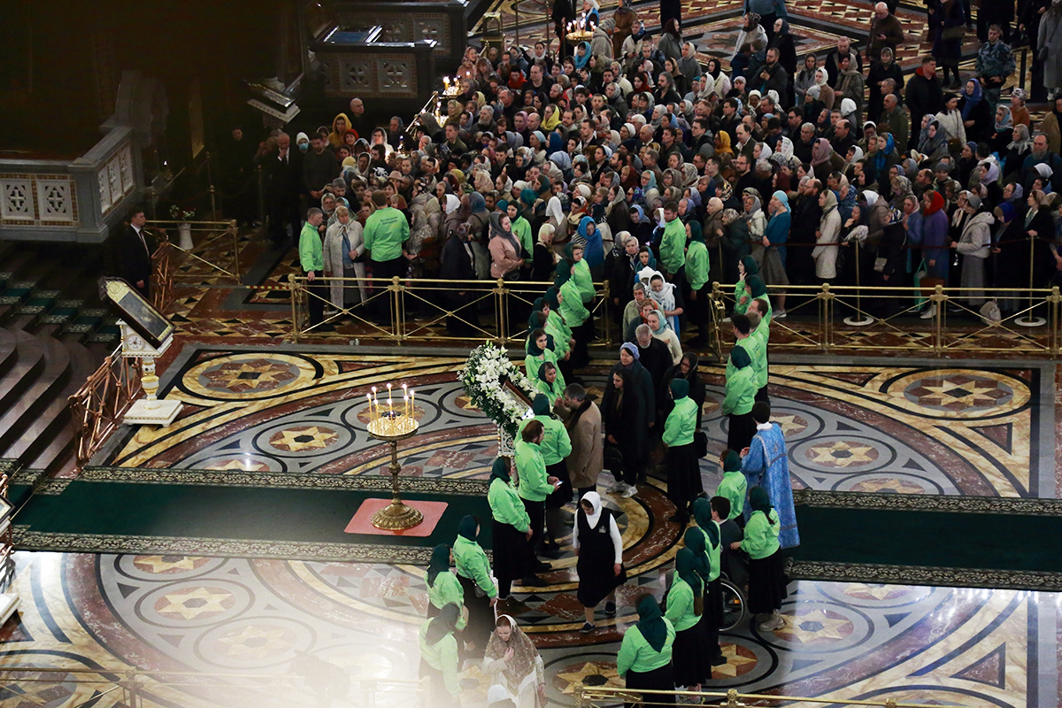 В начале Патриаршего богослужения Серафимо-Дивеевская икона Божией Матери была вынесена из алтаря и установлена на аналое в центре Храма Христа Спасителя.