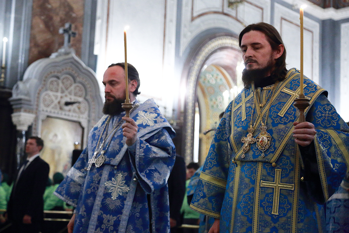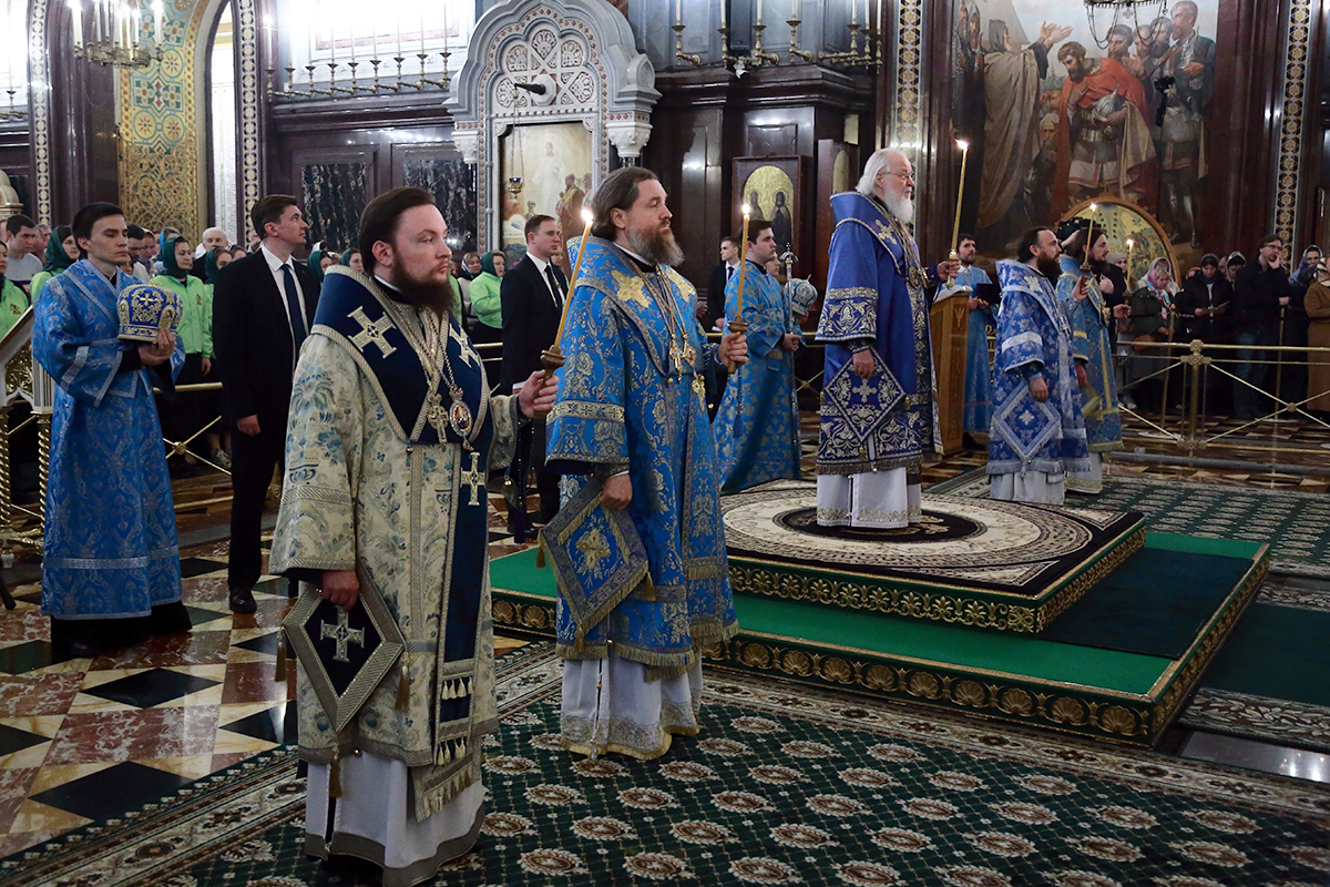Его Святейшеству сослужили: митрополит Воскресенский Григорий, управляющий делами Московской Патриархии, первый викарий Патриарха Московского и всея Руси по г. Москве; митрополит Звенигородский Арсений; епископ Истринский Серафим, председатель Синодального отдела по делам молодежи; епископ Раменский Алексий, личный секретарь Святейшего Патриарха Кирилла; протоиерей Михаил Рязанцев, Ключарь Храма Христа Спасителя; протоиереи: Георгий Мартынов, Андрей Марущак; иереи: Михаил Нараевский, Алексий Тимофеев, Антоний Обухов; иеромонах Арсений (Писарев); иерей Николай Тюрин, клирик храма Спаса Преображения — Патриаршего подворья в Переделкине г. Москвы; архидиакон Константин Барган; протодиаконы: Николай Филатов, Дионисий Пряхин; диаконы: Иоанн Клинцов, Димитрий Стацюк.