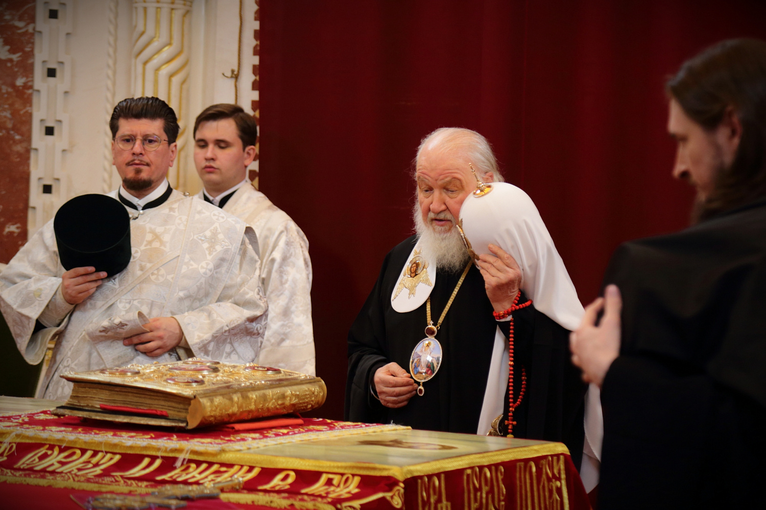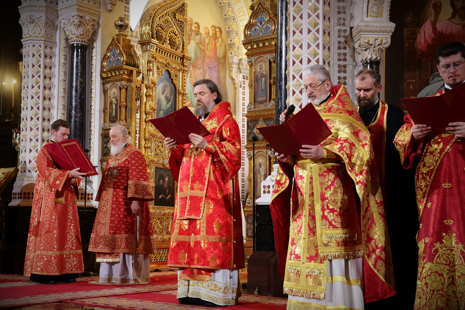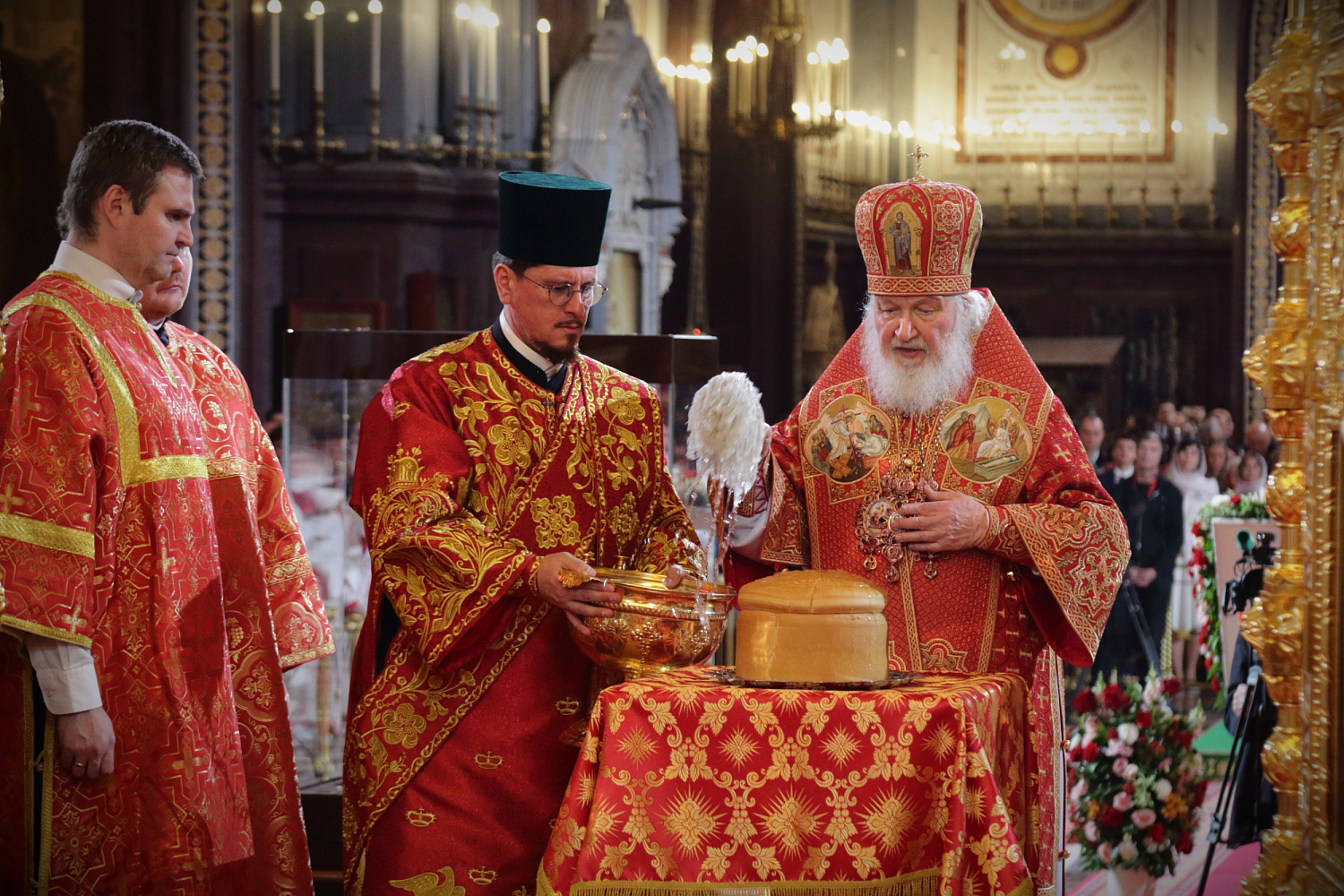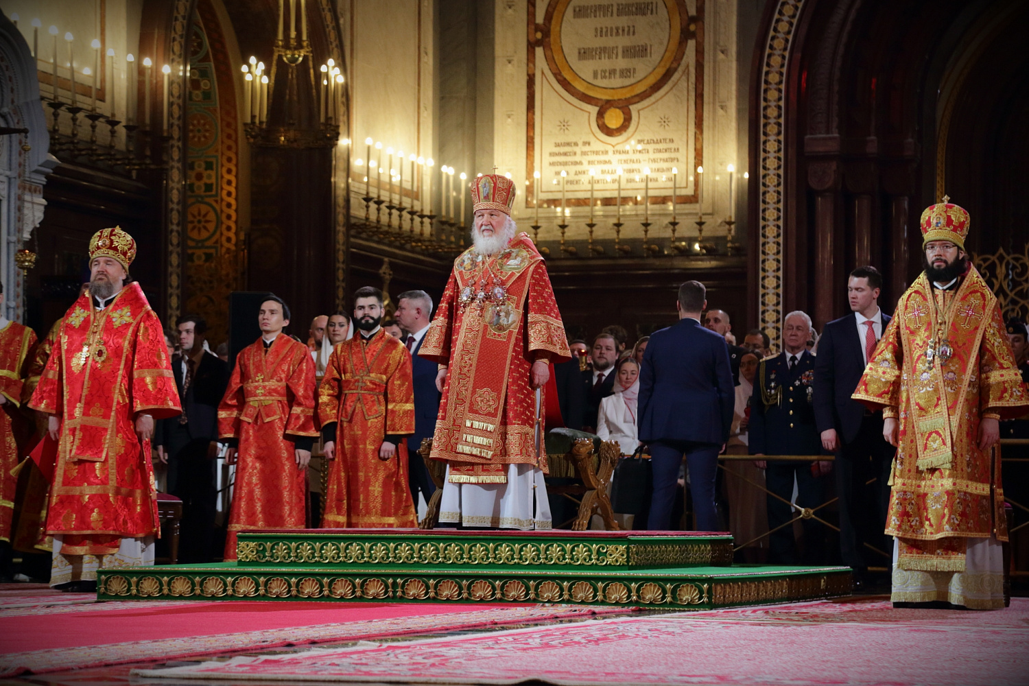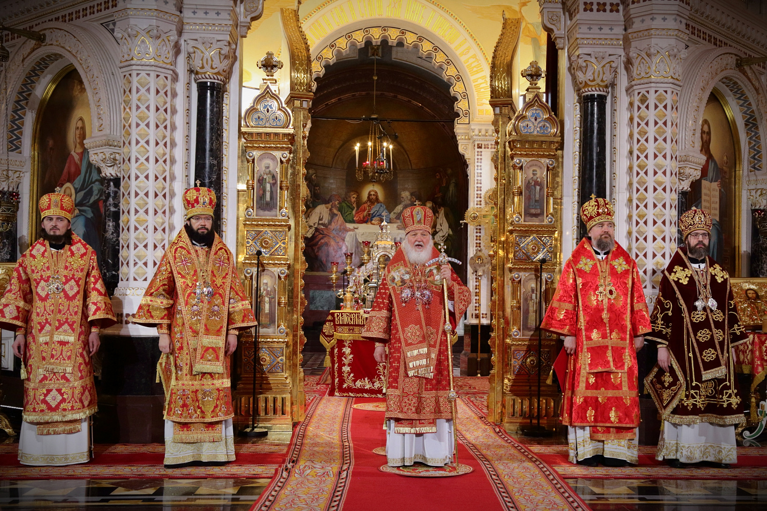 Его Святейшеству сослужили: митрополит Воскресенский Григорий, управляющий делами Московской Патриархии, первый викарий Патриарха Московского и всея Руси по г. Москве; митрополит Волоколамский Антоний, председатель Отдела внешних церковных связей Московского Патриархата; архиепископ Зеленоградский Савва, председатель Синодального миссионерского отдела, заместитель управляющего делами Московской Патриархии; епископ Раменский Алексий, личный секретарь Святейшего Патриарха Кирилла; протоиерей Михаил Рязанцев, Ключарь Храма Христа Спасителя; протоиереи: Георгий Мартынов, Андрей Марущак; игумен Амвросий (Коньков); иеромонах Косьма (Карташов); протоиерей Владимир Мишкорез; иеромонах Аристоклий (Лисицин); иерей Николай Кривотулов; иерей Николай Тихомиров; иерей Григорий Шинов; иерей Алексей Авдюшко; иерей Виктор Гелюта; иерей Михаил Минаев; иерей Александр Никитин; иереи: Михаил Нараевский, Алексий Тимофеев, Антоний Обухов; иерей Михаил Алекумов; архидиакон Константин Барган; протодиаконы: Николай Филатов, Дионисий Пряхин; диаконы: Иоанн Клинцов, Димитрий Стацюк; диакон Иван Змиёв; диакон Виталий Макиев.