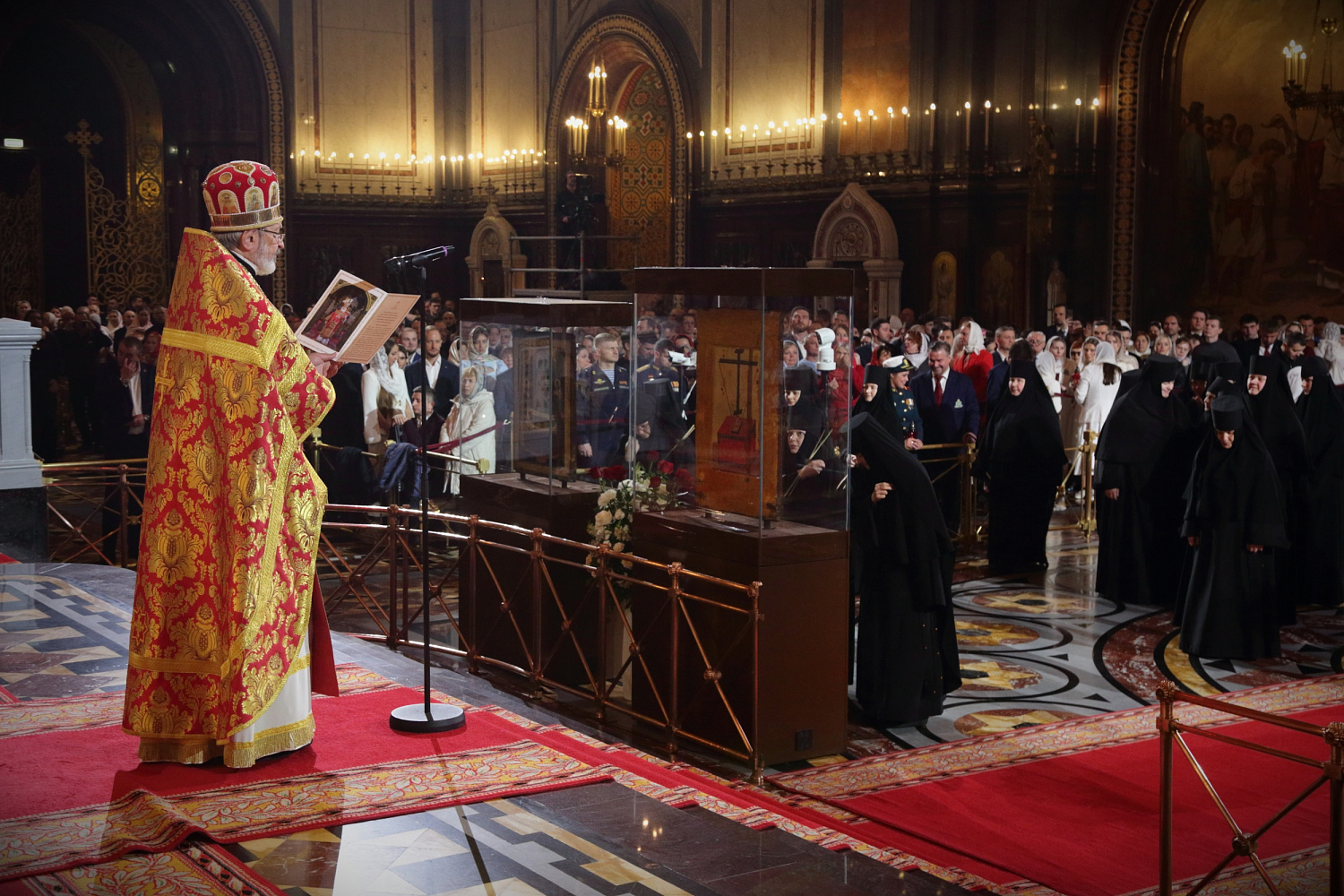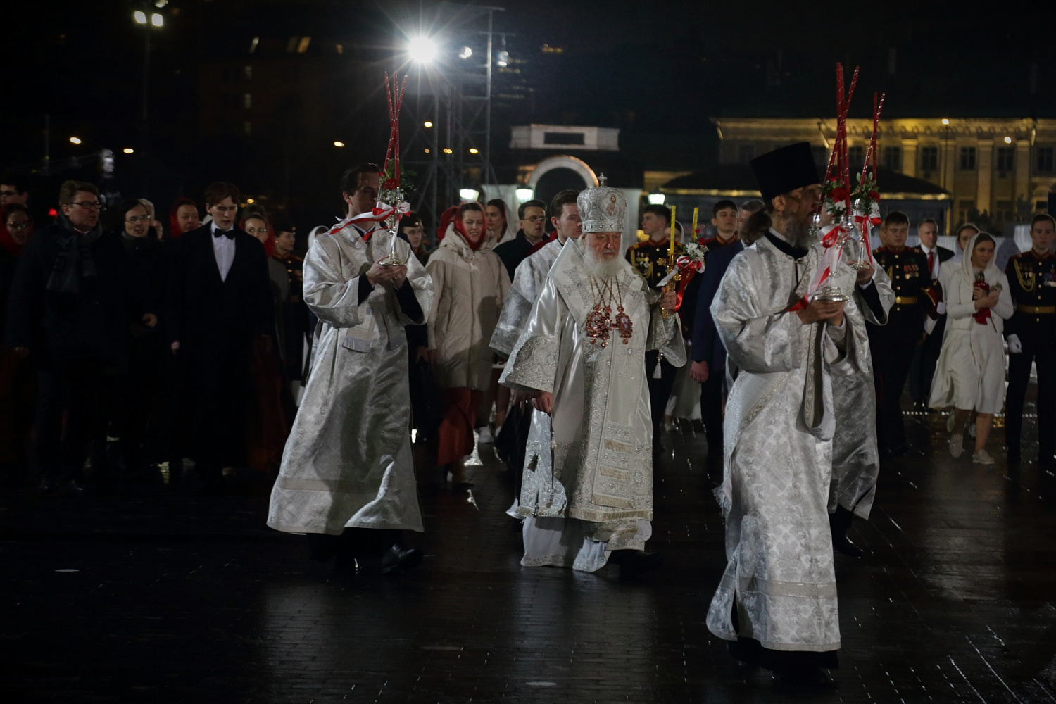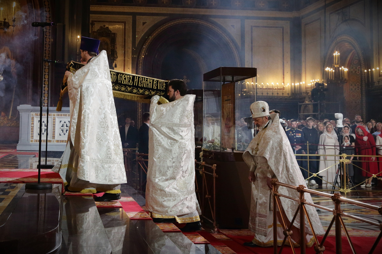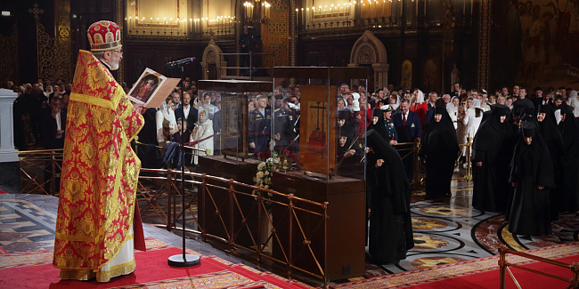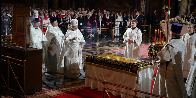 От всего православного народа, в том числе от этих тысяч людей, которые сегодня здесь присутствуют, я сердечно благодарю Вас за возвращение святынь в родной дом! Благословение Божие да пребывает с Вами, с Вашими родными, близкими, с Вашими коллегами, со всеми теми, кто вместе с Вами трудится сегодня во благо нашего Отечества! Храни Вас Господь!»