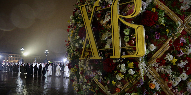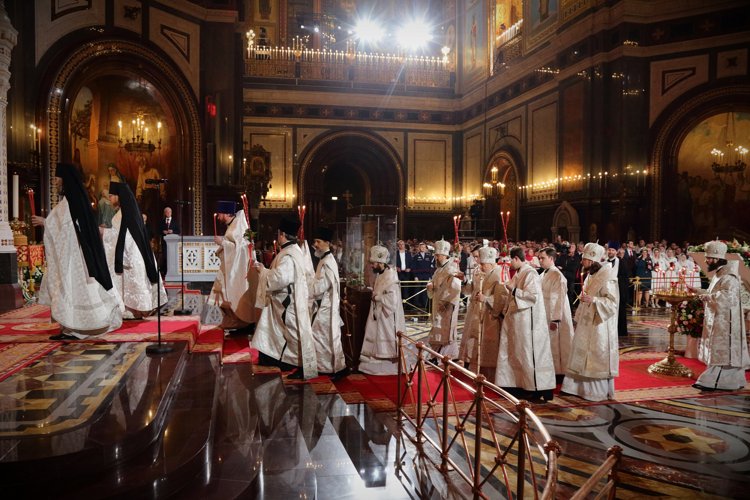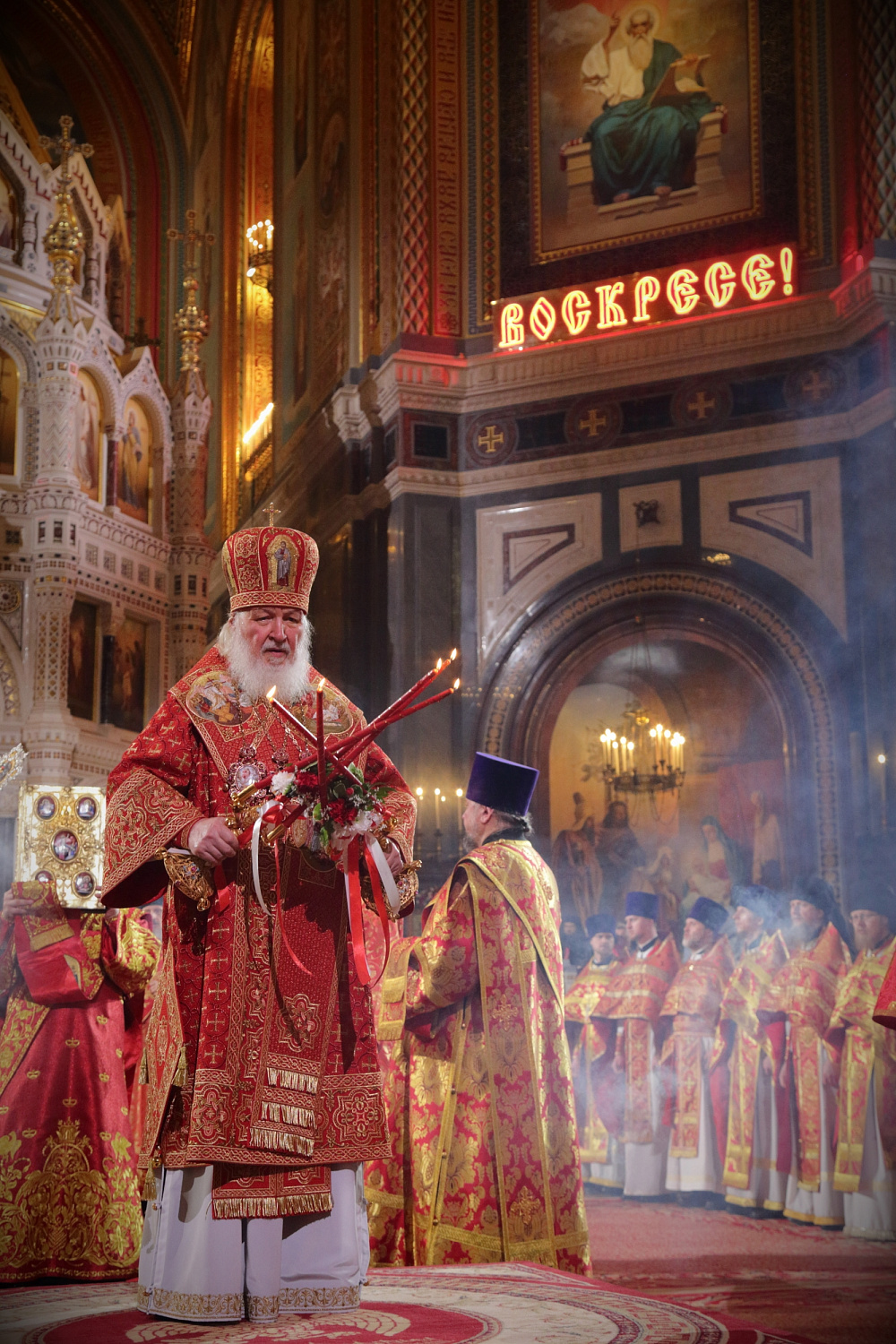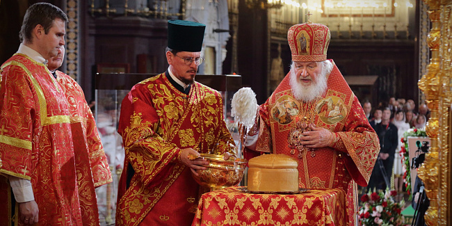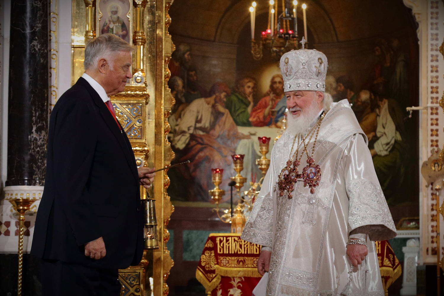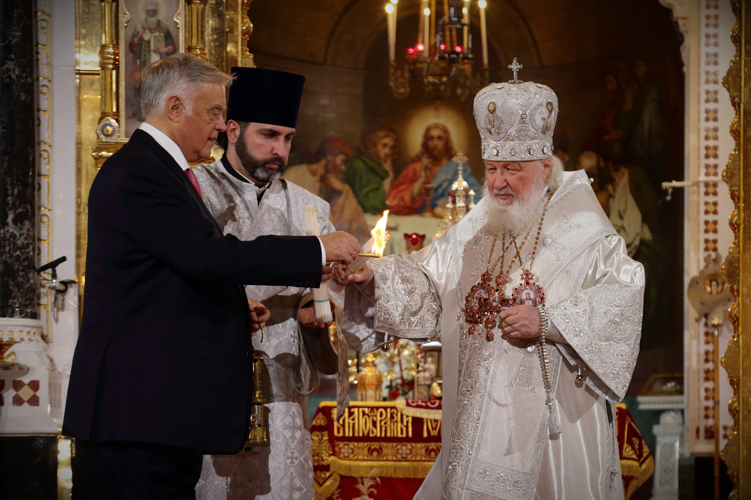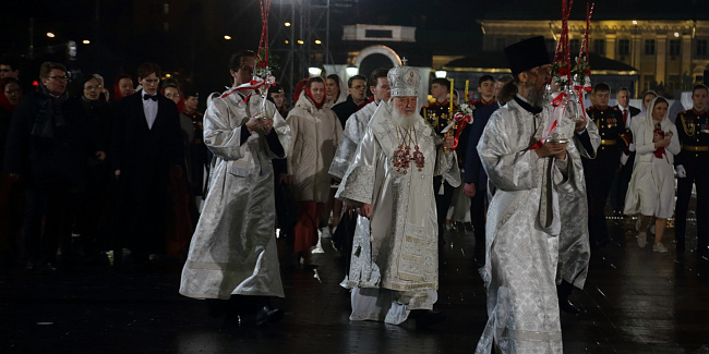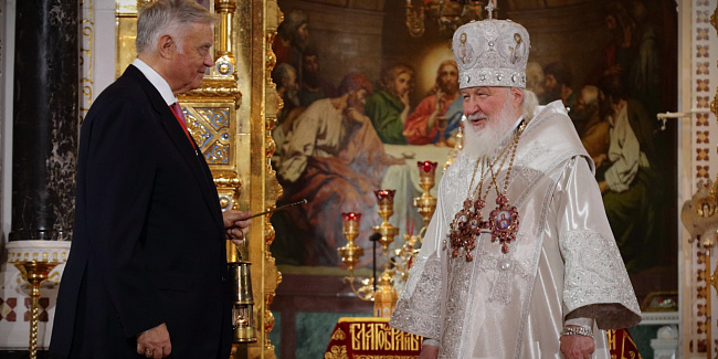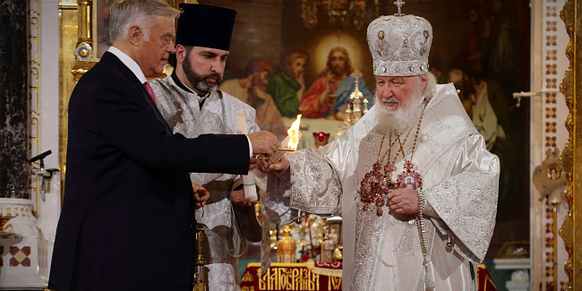 Перед началом крестного хода В.И. Якунин на солее Храма Христа Спасителя передал Благодатный огонь Предстоятелю Русской Православной Церкви.