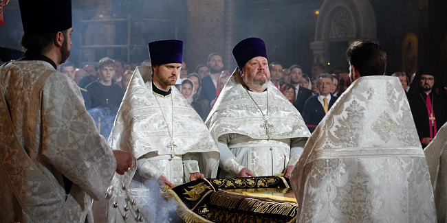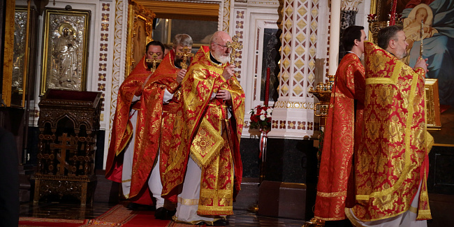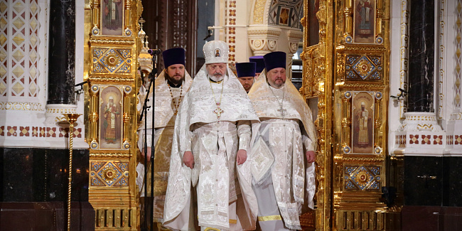 За Пасхальной заутреней Предстоятель Русской Церкви прочитал Слово огласительное святителя Иоанна Златоуста на Святую Пасху.