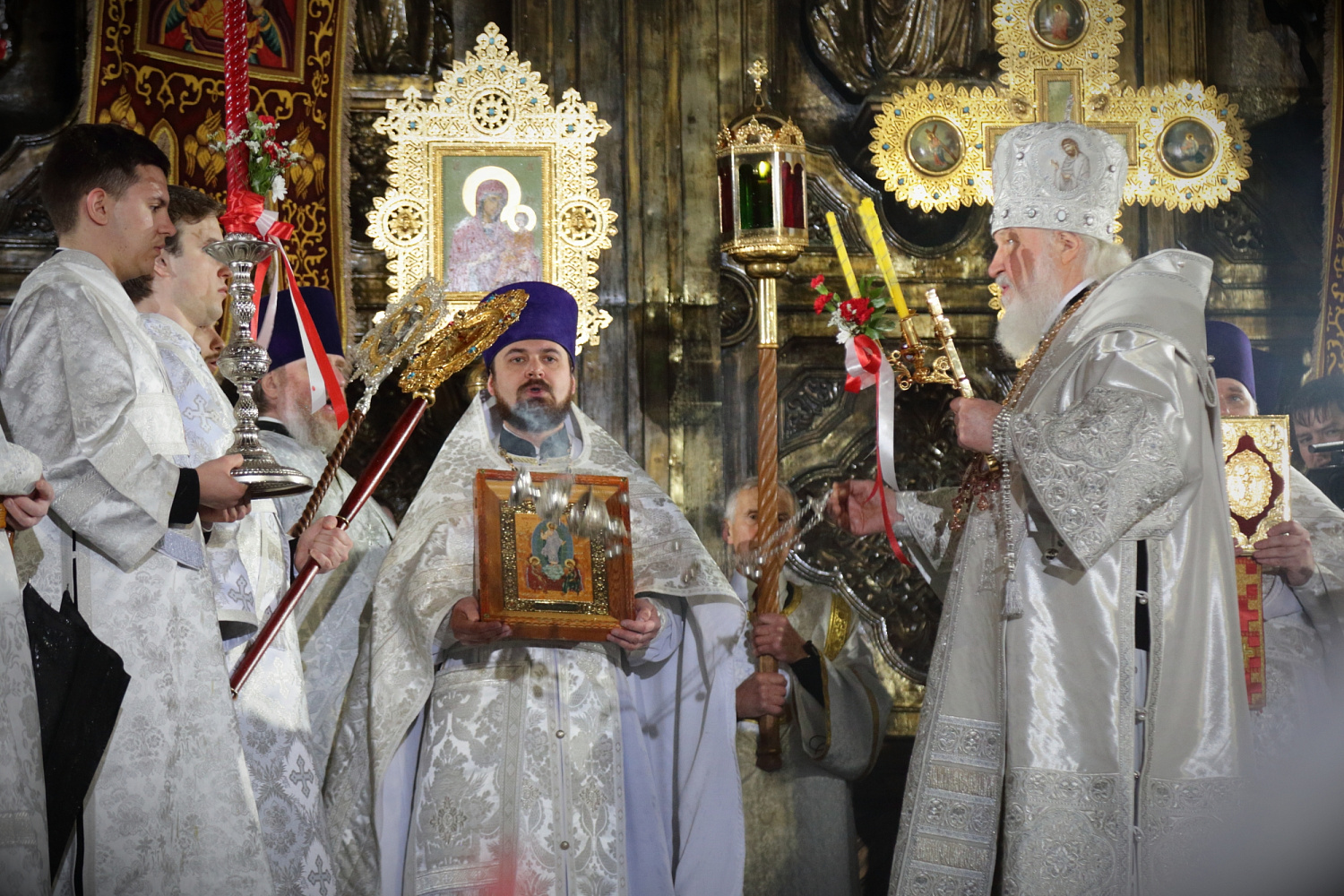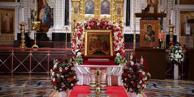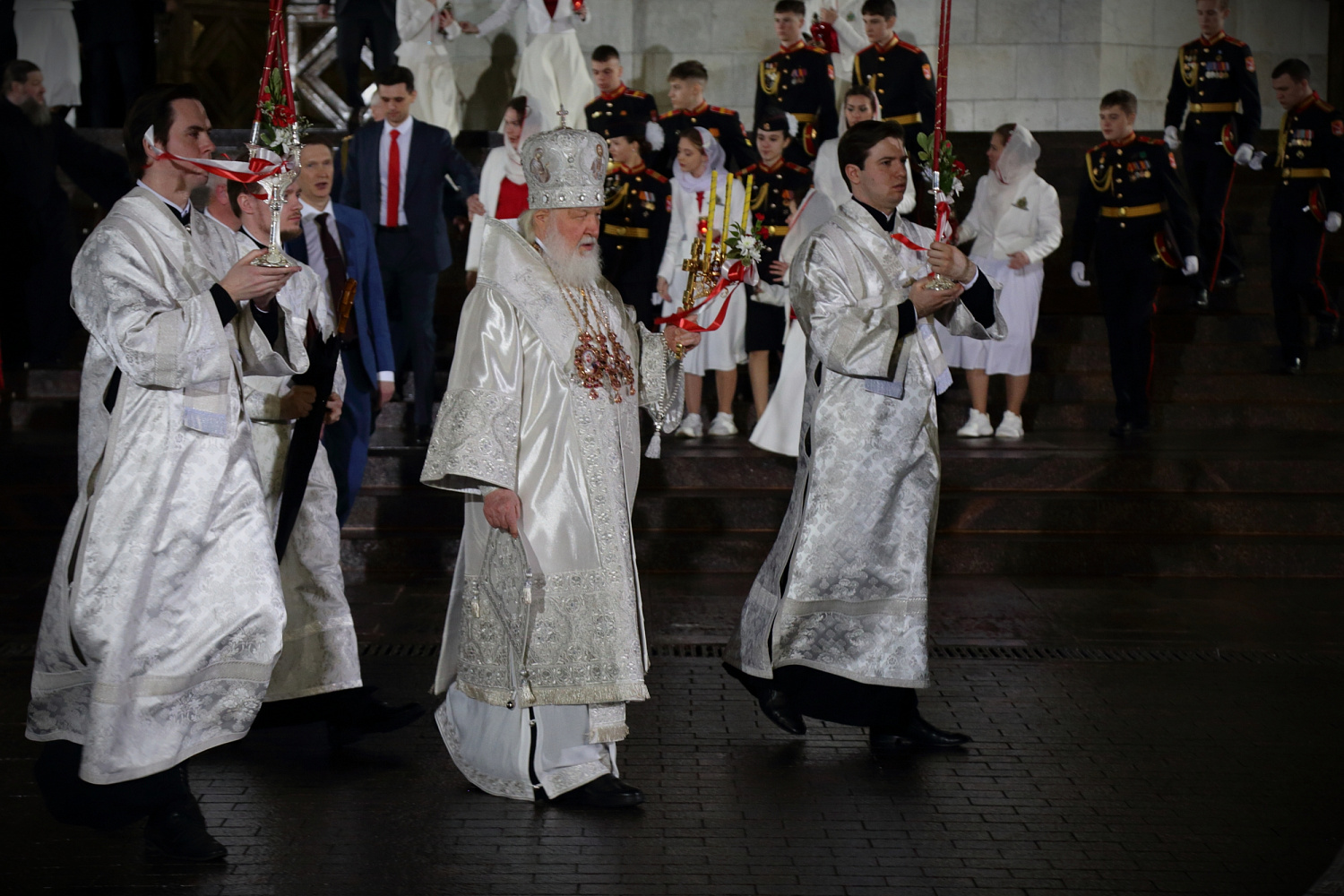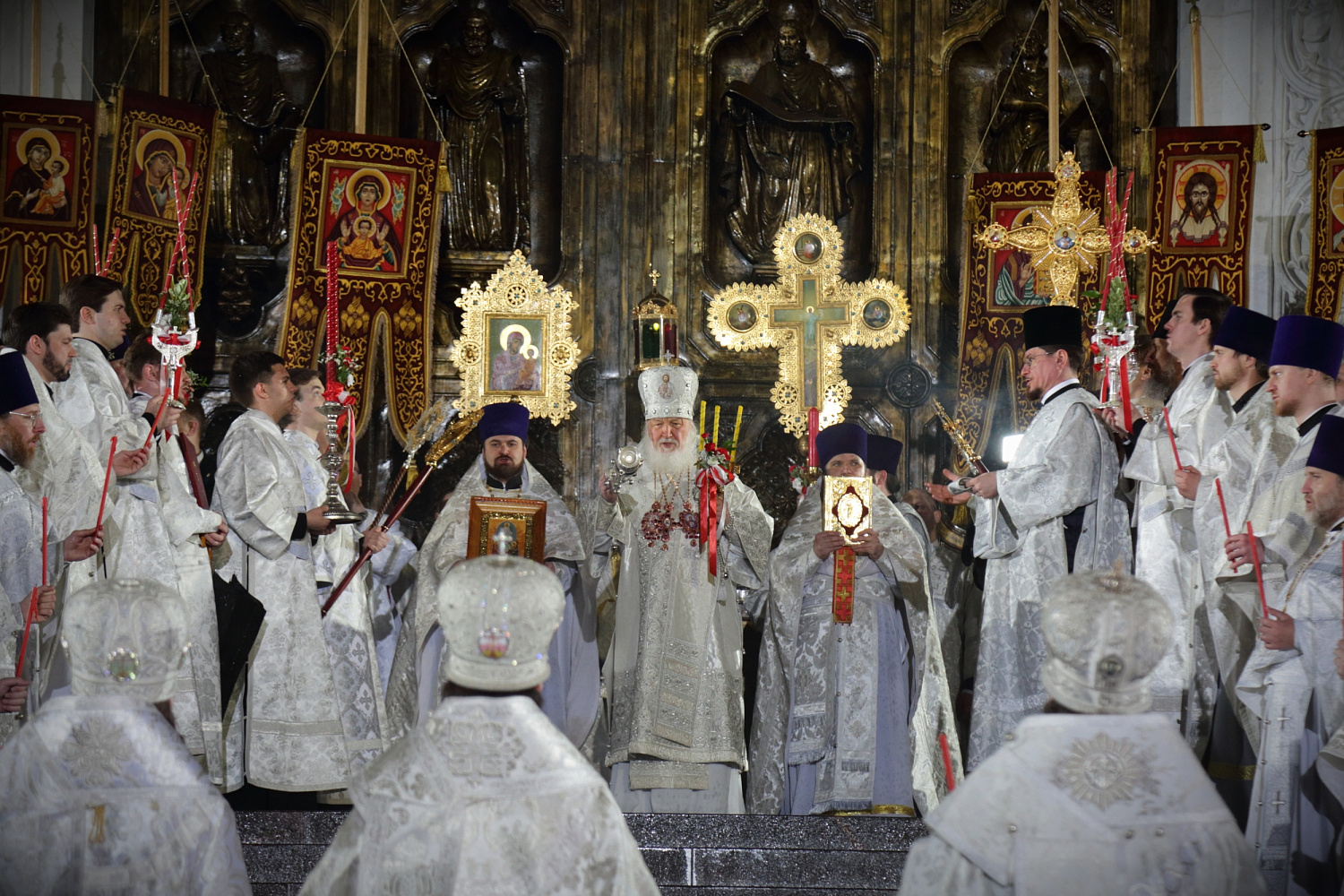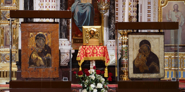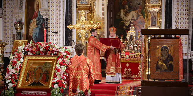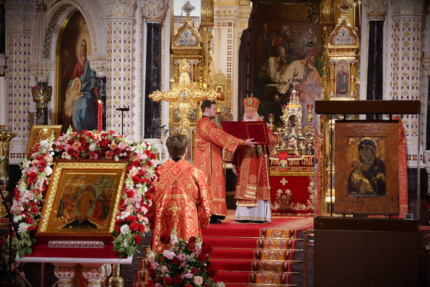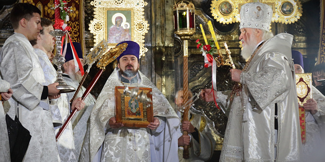 Затем Святейший Владыка рассказал о состоявшейся передаче Церкви чудотворных Владимирской и Донской икон Божией Матери: «В преддверии праздника Входа Господня в Иерусалим совершилось событие исторического значения. При содействии Президента Российской Федерации Владимира Владимировича Путина, присутствующего сегодня вместе с нами на Пасхальном богослужении, состоялась передача Русской Православной Церкви из Государственной Третьяковской галереи великих святынь — наиболее почитаемых на Руси чудотворных икон — Владимирской и Донской икон Божией Матери. Две самые почитаемые иконы возвращены Церкви и сегодня они находятся здесь, в кафедральном соборном Храме Христа Спасителя города Москвы».