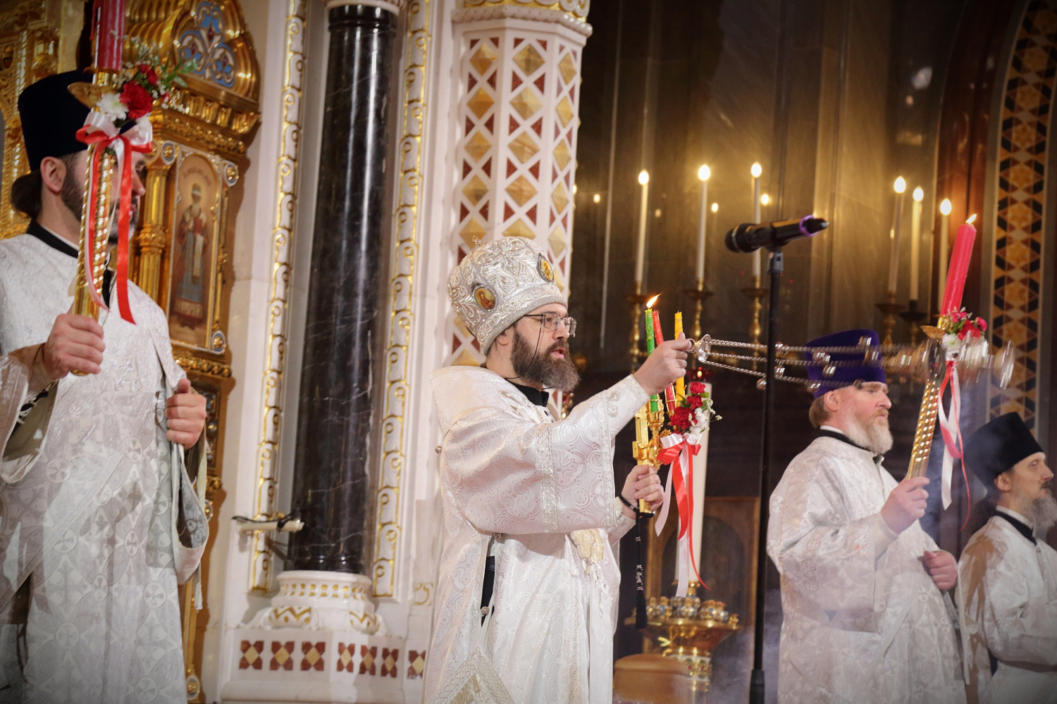 Святейший Владыка возжег от Благодатного огня свечи, которые были переданы участникам богослужения.