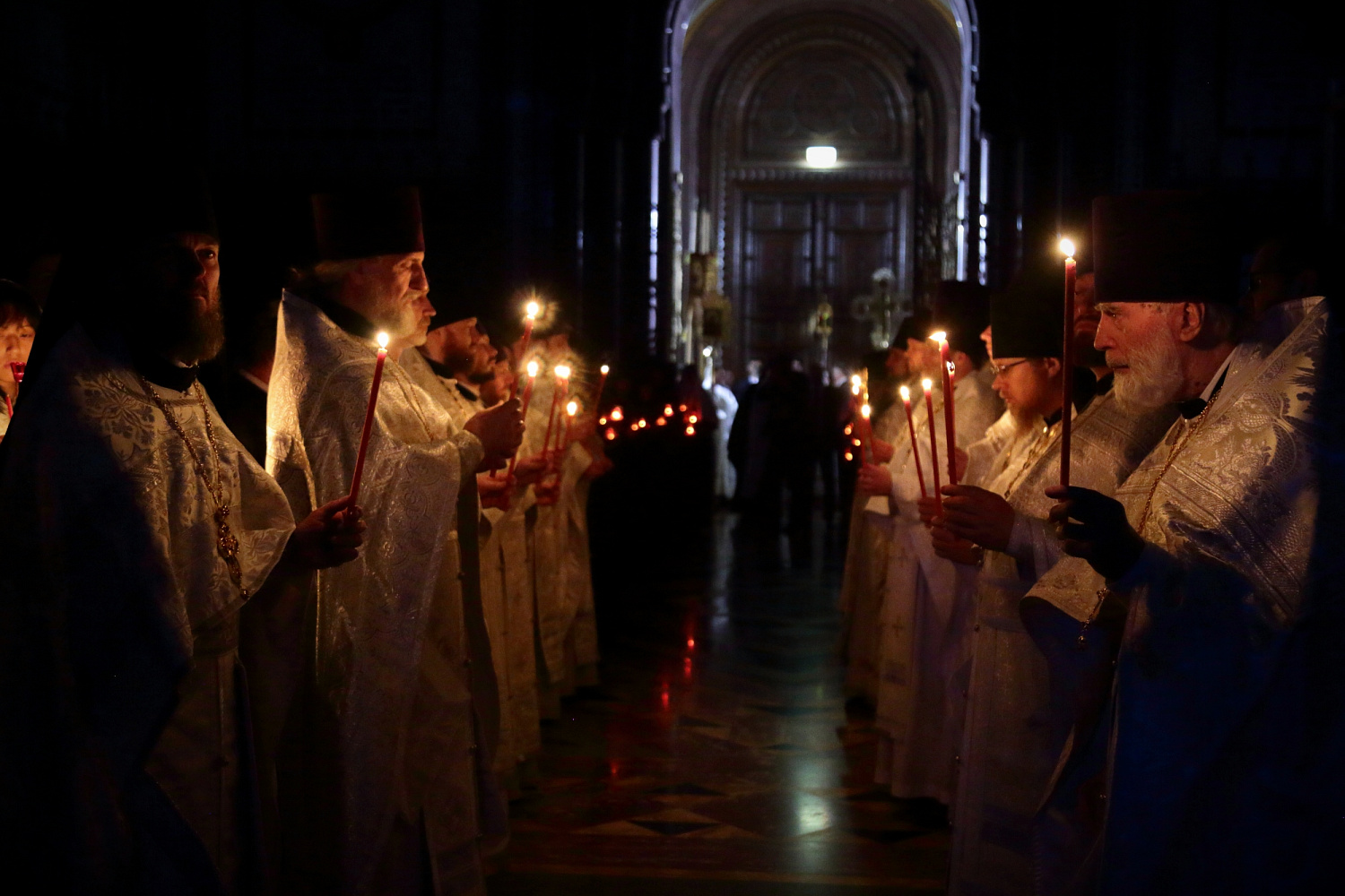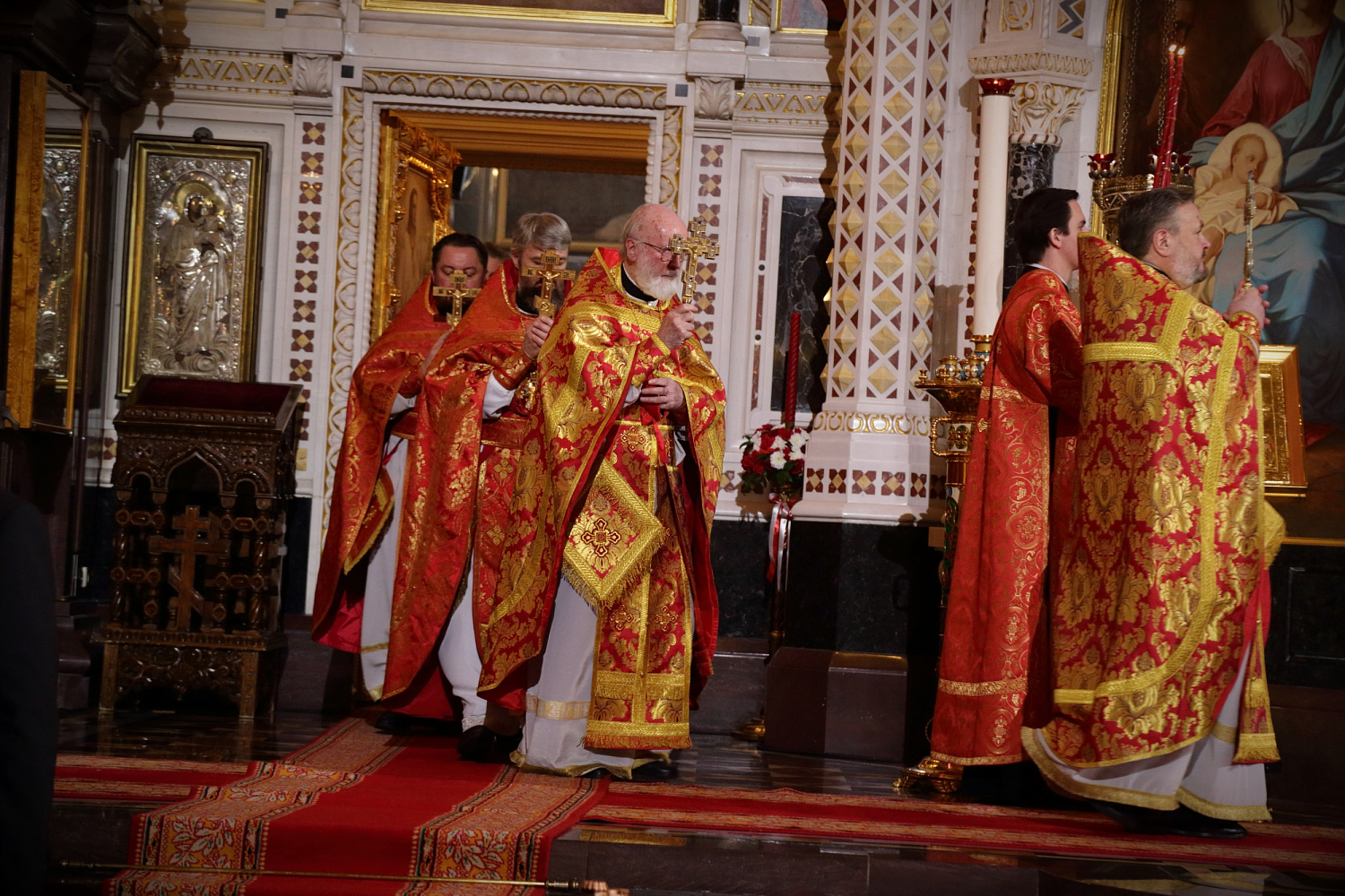 По традиции после пения пасхального канона в алтаре Святейший Патриарх Кирилл, архиереи и духовенство сменили белые облачения на красные.