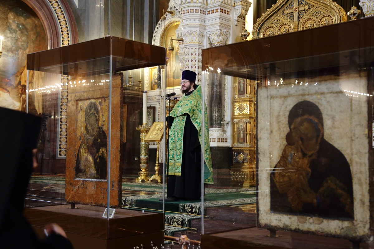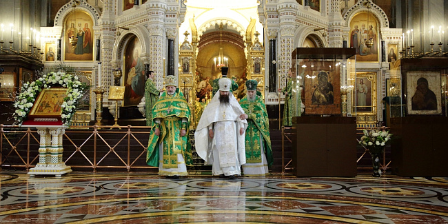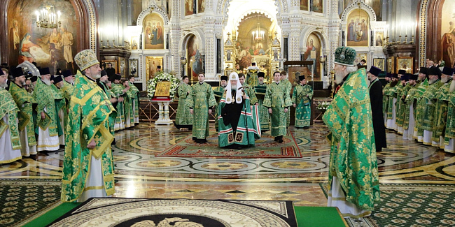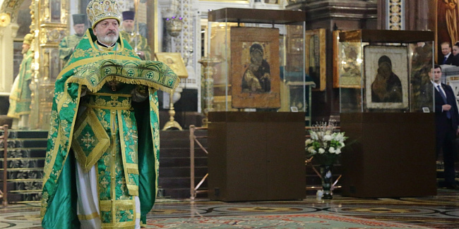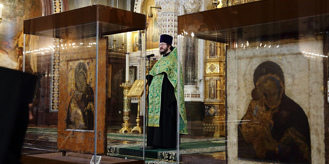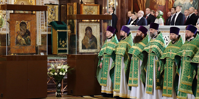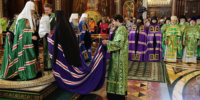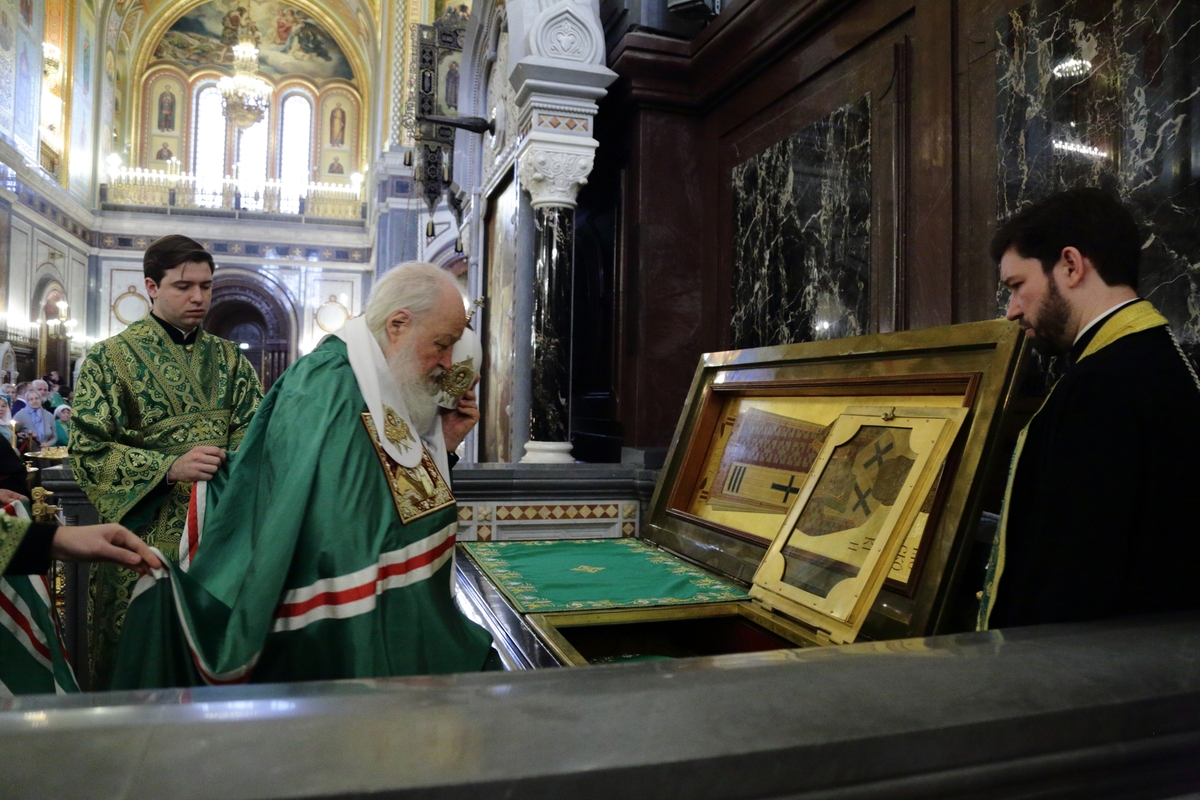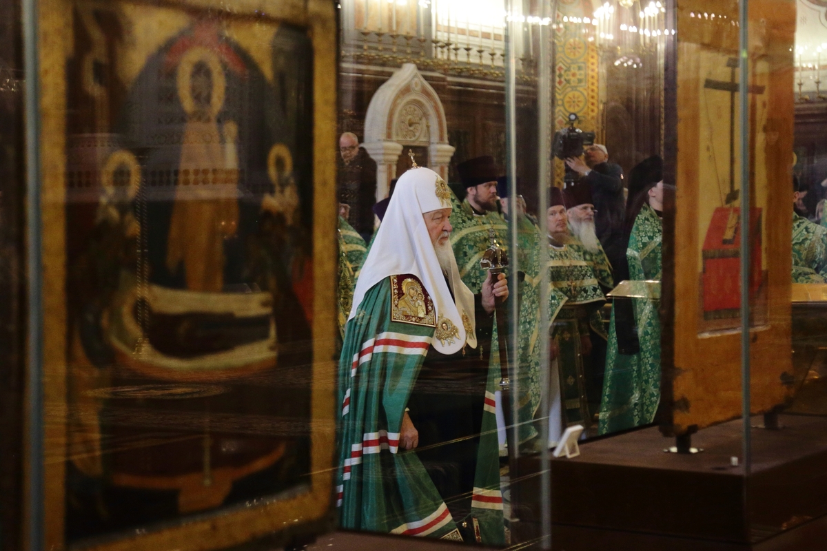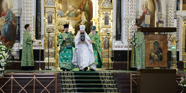 По прибытии в Храм Христа Спасителя перед началом богослужения Предстоятель Русской Православной Церкви поклонился чудотворным Владимирской и Донской иконам Божией Матери и честным мощам святителя Филарета, митрополита Московского.