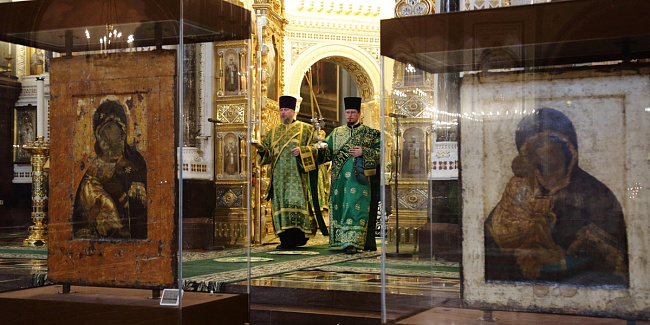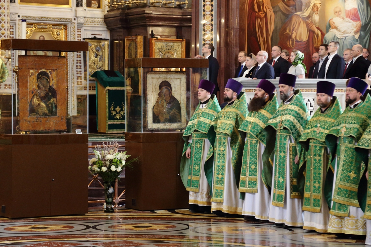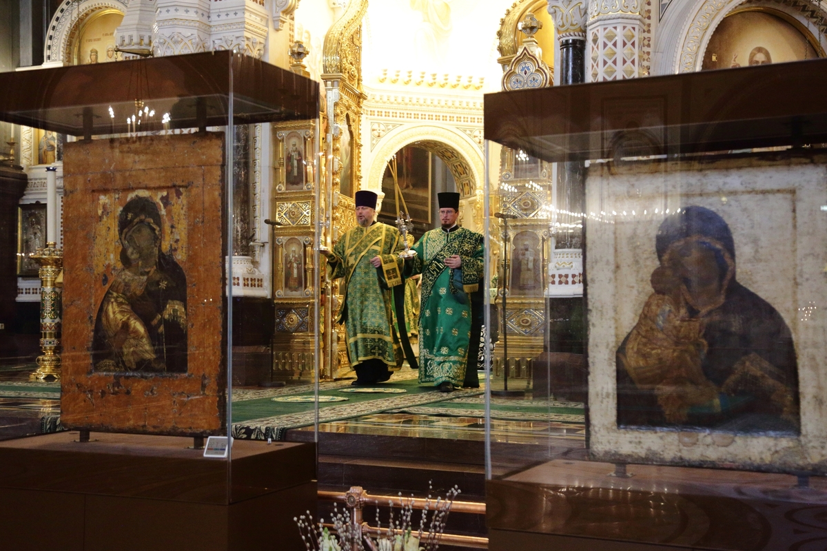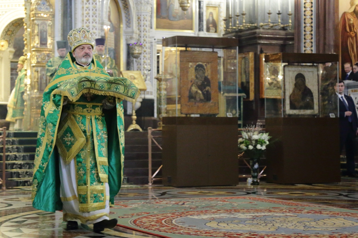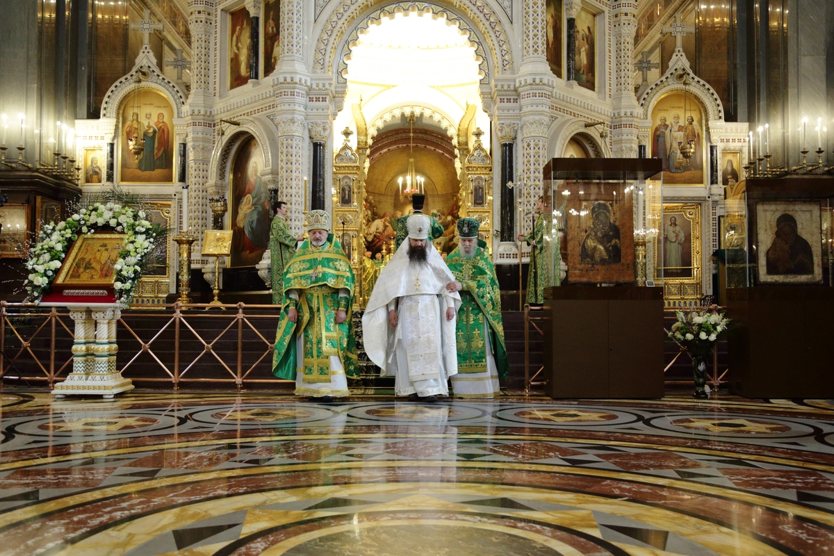 По прибытии в Храм Христа Спасителя перед началом богослужения Предстоятель Русской Православной Церкви поклонился чудотворным Владимирской и Донской иконам Божией Матери и честным мощам святителя Филарета, митрополита Московского.